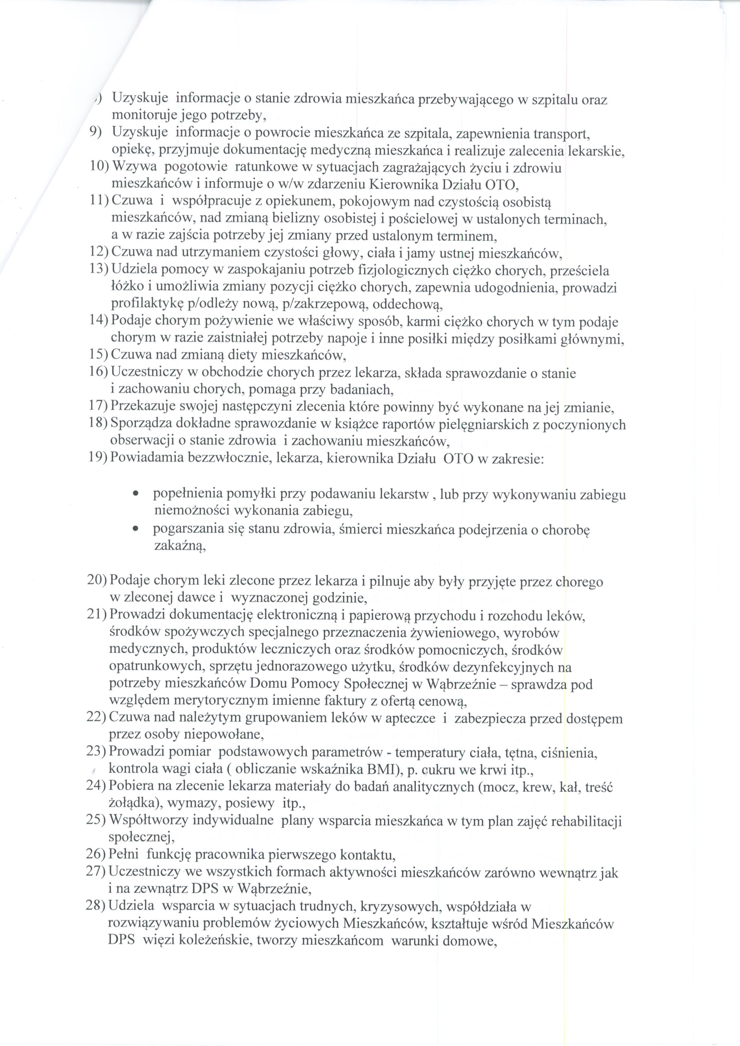 - Wykonuje inne czynności i zadania dotyczące zabezpieczenia usług bytowych, opiekuńczych, wspomagających skierowanych do mieszkańców zleconych przez bezpośredniego przełożonego i Dyrektora Domu Pomocy Społecznej w Wąbrzeźnie.