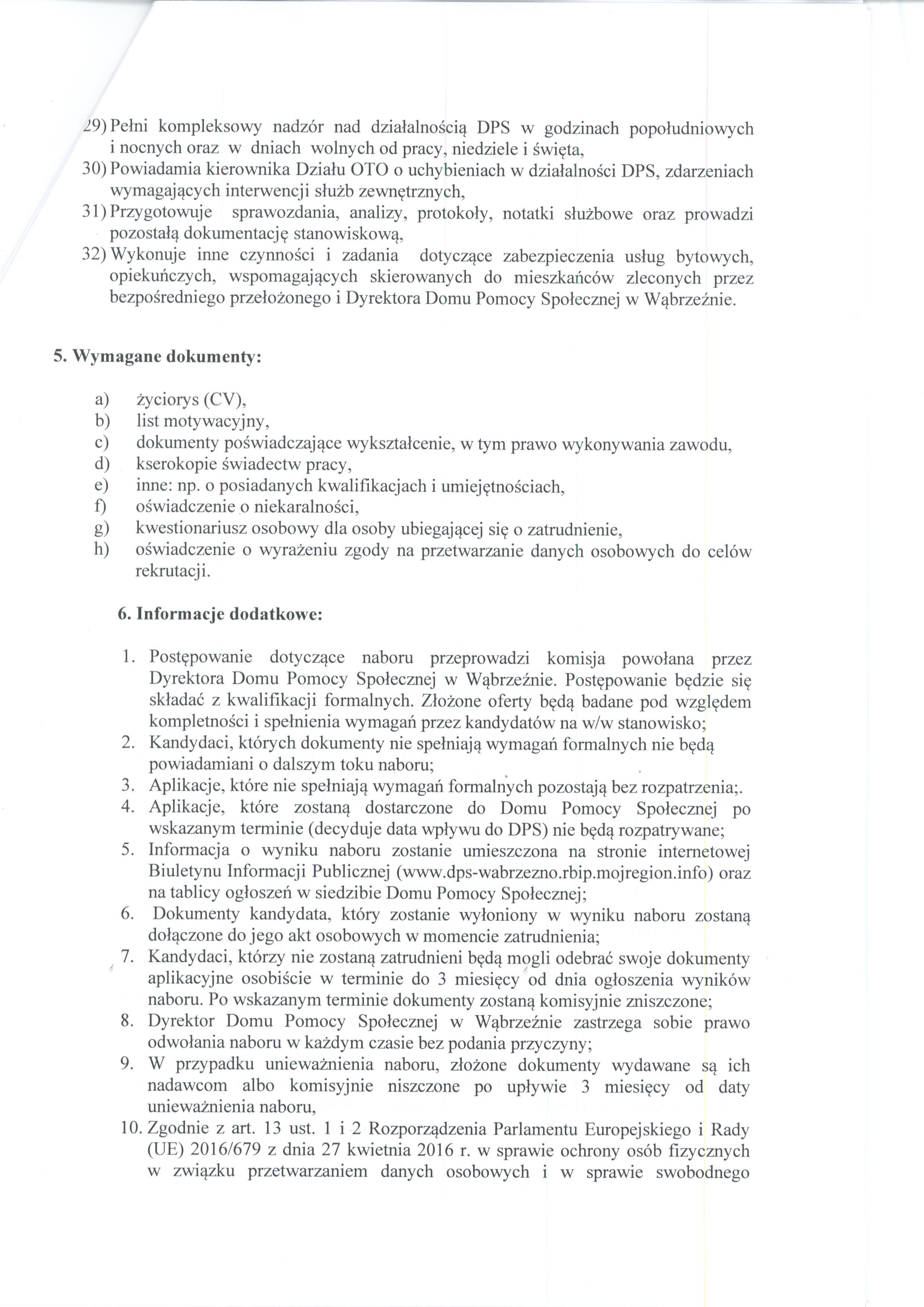 Informacja o wyniku naboru będzie umieszczona na stronie internetowej Biuletynu Informacji Publicznej (dps-wabrzezno.rbip.mojregion.info oraz na tablicy informacyjnej w siedzibie Domu)