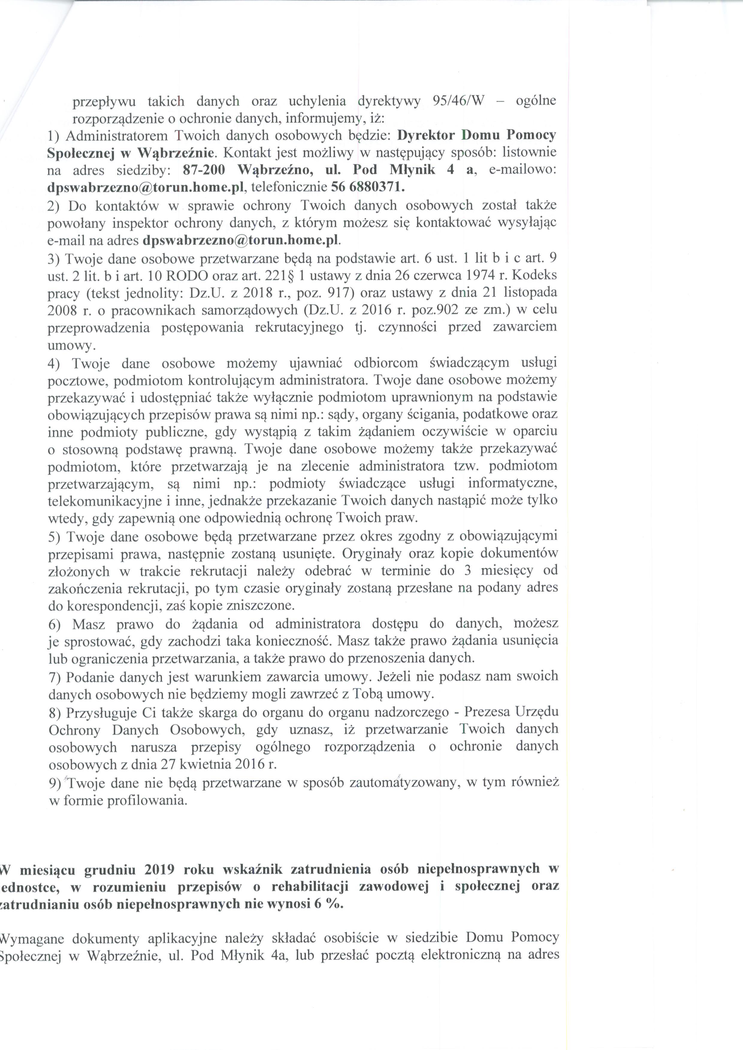 - Dyrektor Domu Pomocy Społecznej w Wąbrzeźnie zastrzega sobie prawo odwołania naboru w każdym czasie bez podania przyczyny;