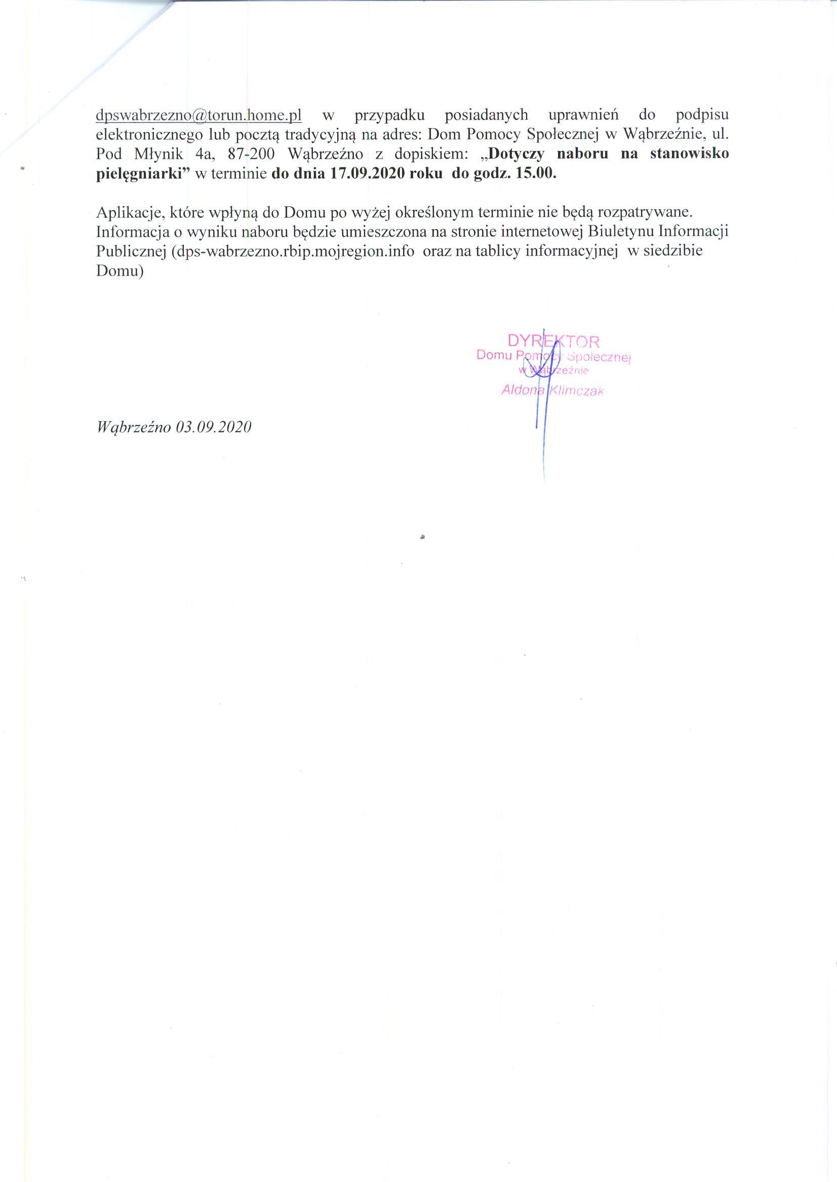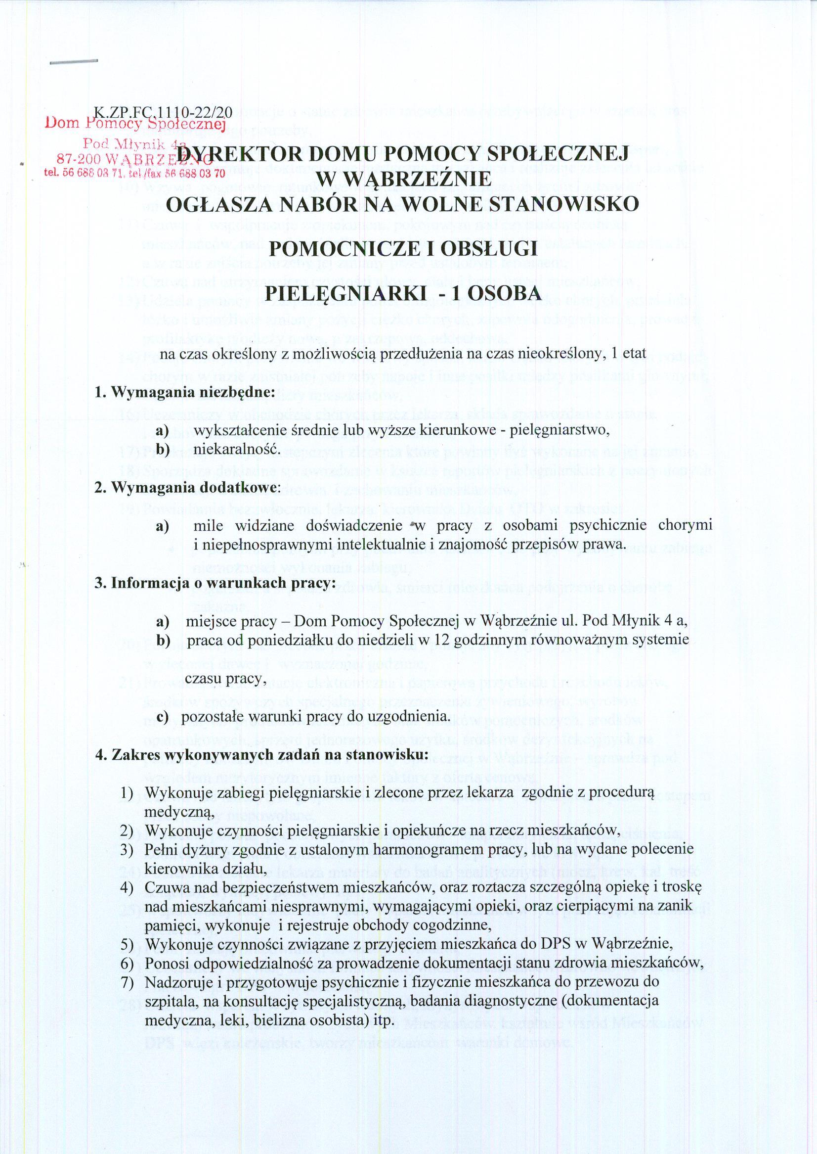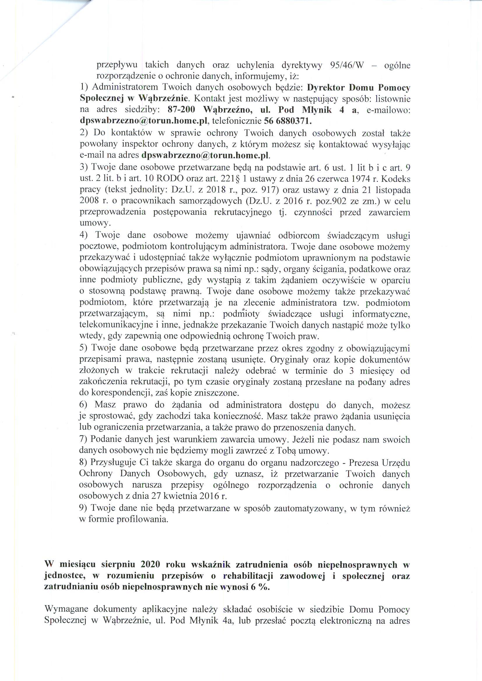 - Dyrektor Domu Pomocy Społecznej w Wąbrzeźnie zastrzega sobie prawo odwołania naboru w każdym czasie bez podania przyczyny;