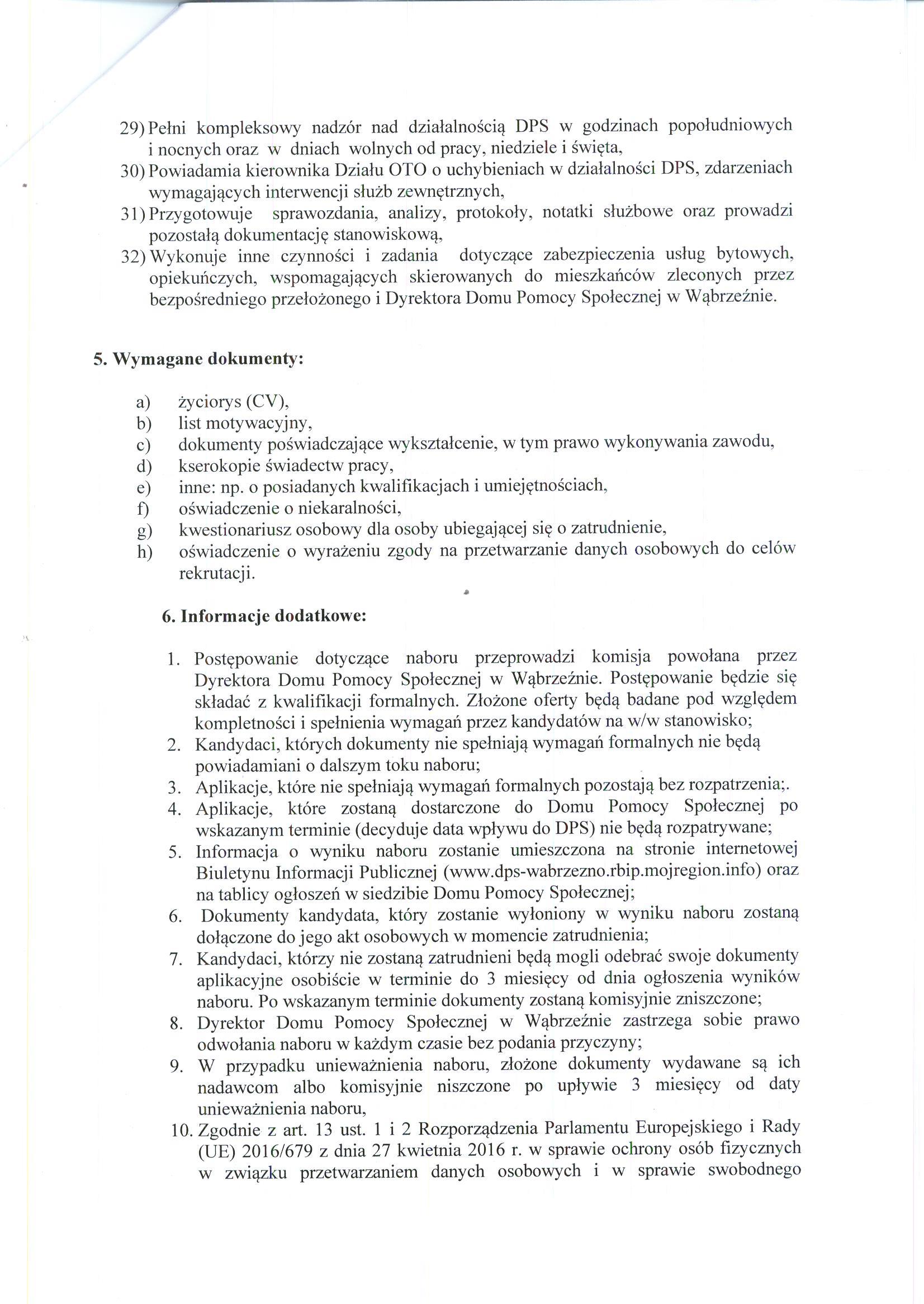 - Informacja o wyniku naboru zostanie umieszczona na stronie internetowej Biuletynu Informacji Publicznej (www.dps-wabrzezno.rbip.mojregion.info) oraz na tablicy ogłoszeń w siedzibie Domu Pomocy Społecznej;