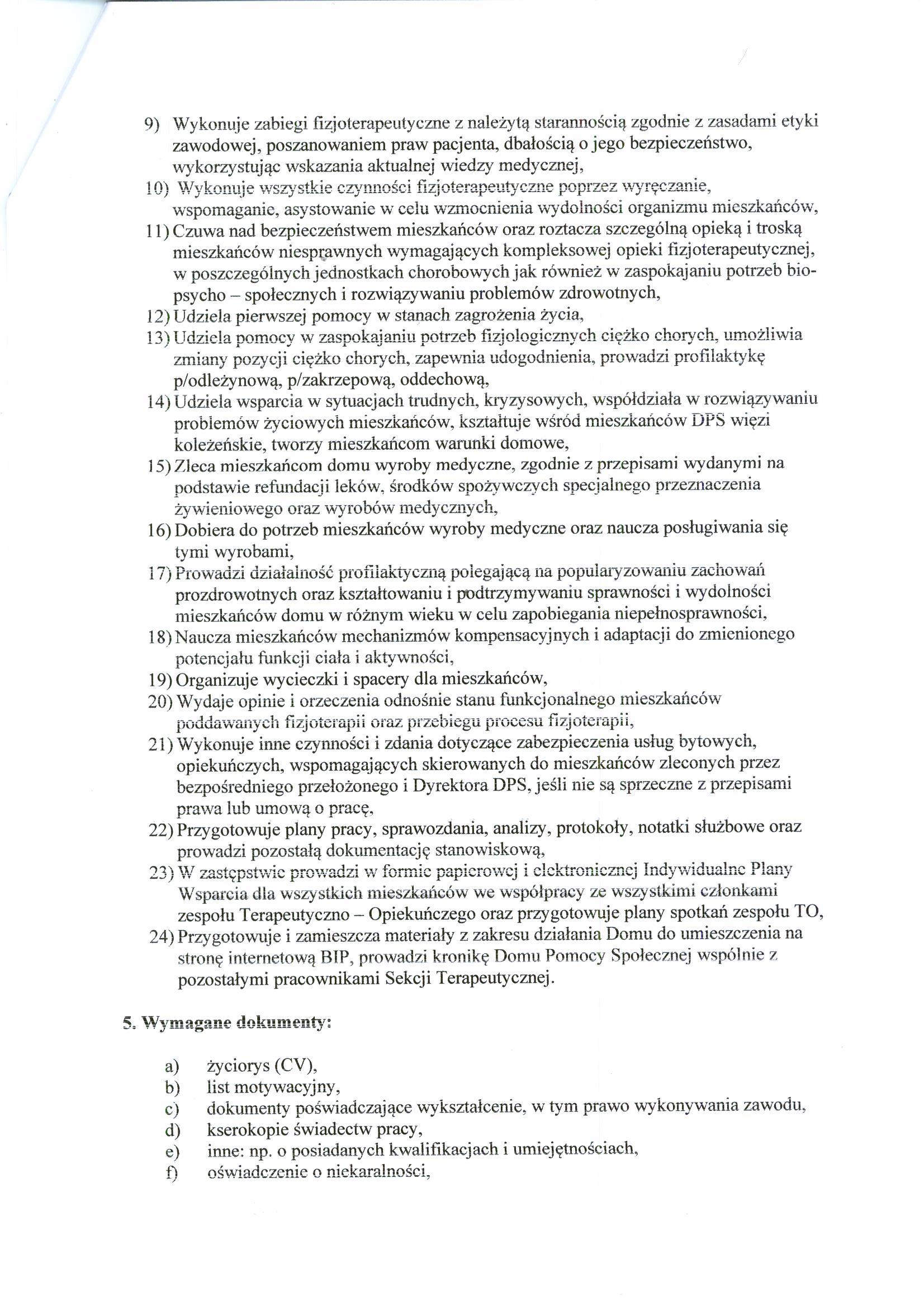 - Czuwa nad bezpieczeństwem mieszkańców oraz roztacza szczególną opieką i troską mieszkańców niesprawnych wymagających kompleksowej opieki fizjoterapeutycznej, w poszczególnych jednostkach chorobowych jak również w zaspokajaniu potrzeb bio- psycho – społecznych i rozwiązywaniu problemów zdrowotnych,