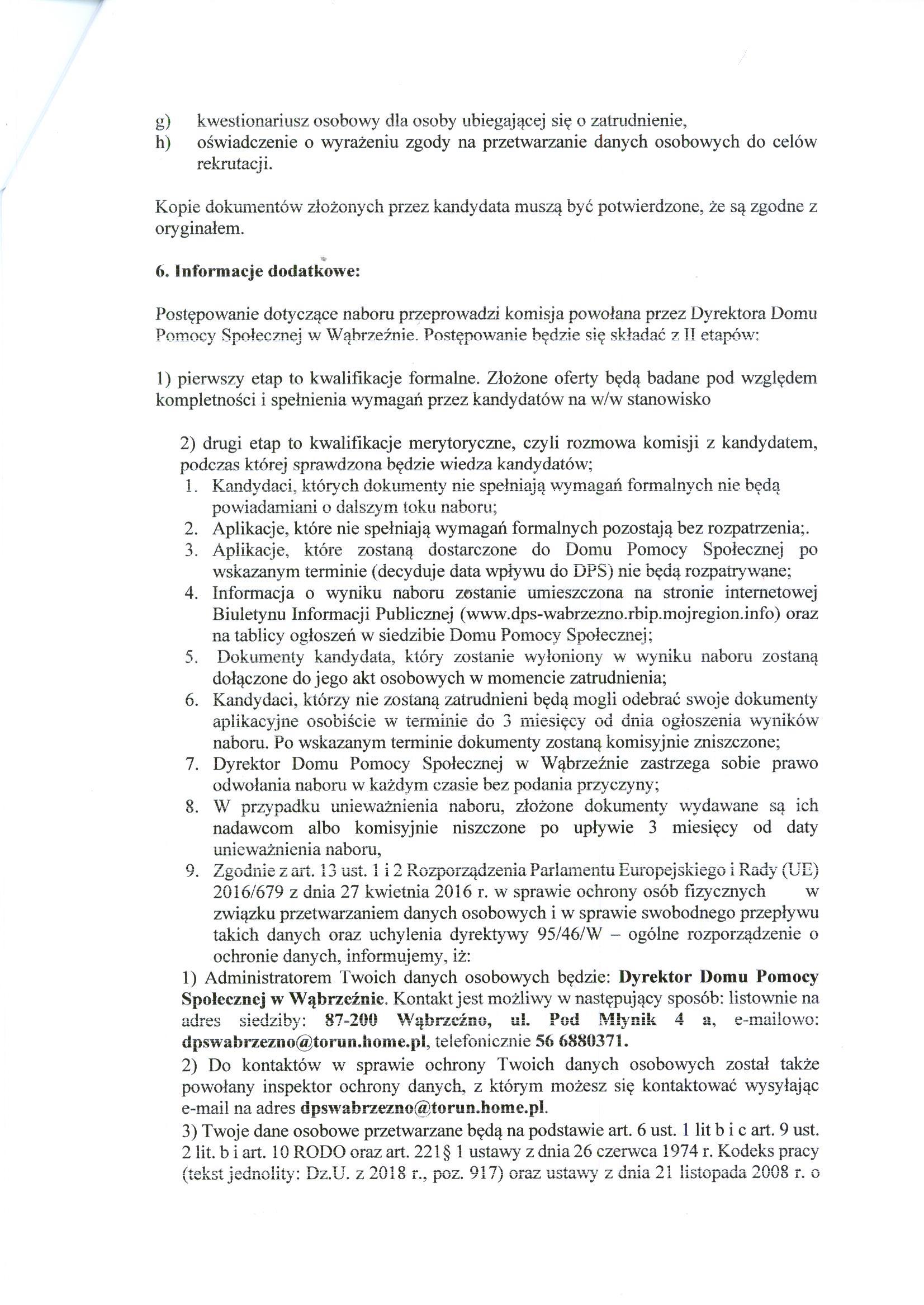 - Dyrektor Domu Pomocy Społecznej w Wąbrzeźnie zastrzega sobie prawo odwołania naboru w każdym czasie bez podania przyczyny;