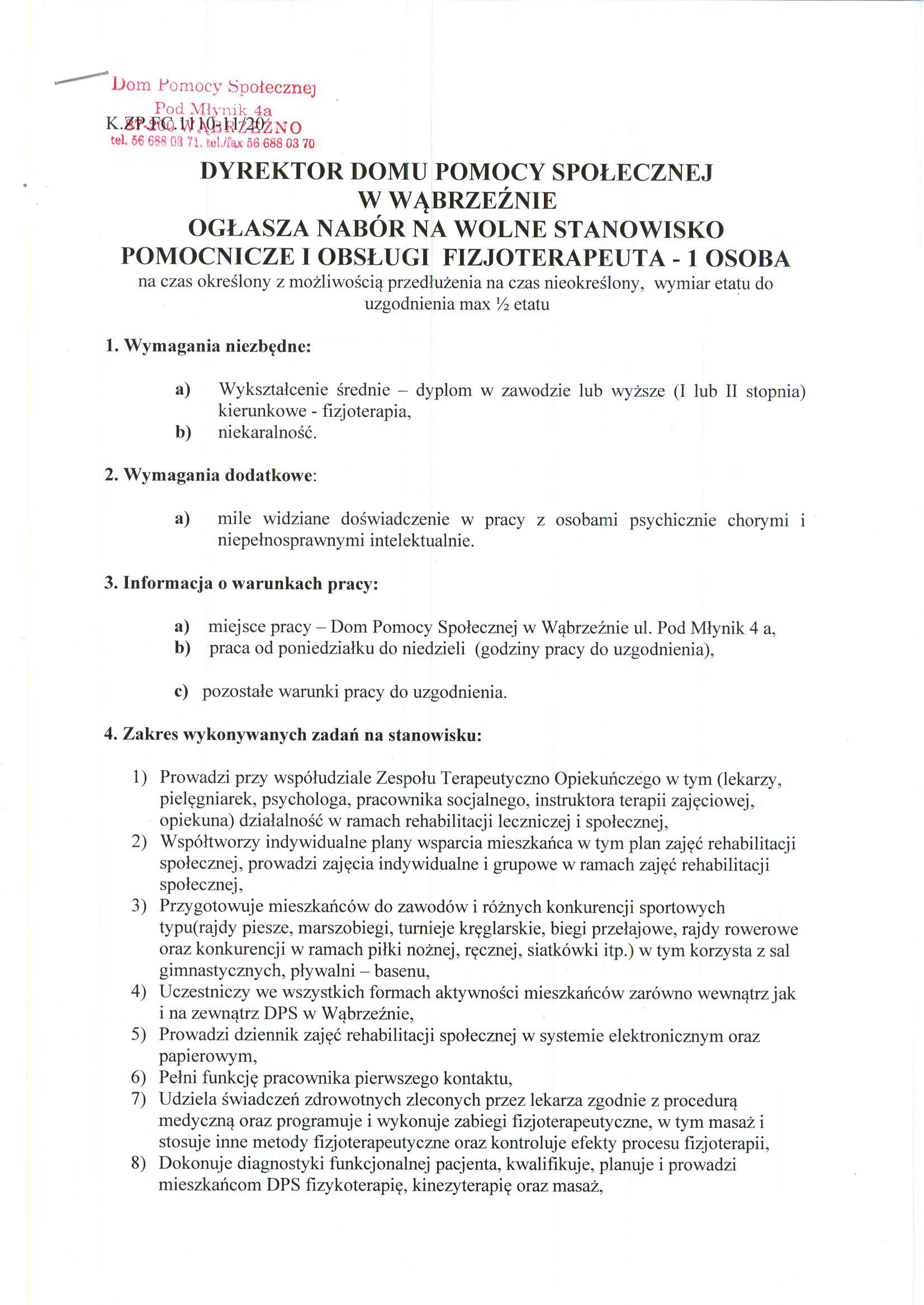 Nabór na wolne stanowisko pomocnicze i obsługi fizjoterapeuta w Domu Pomocy Społecznej w Wąbrzeźnie max 1/2 etatu