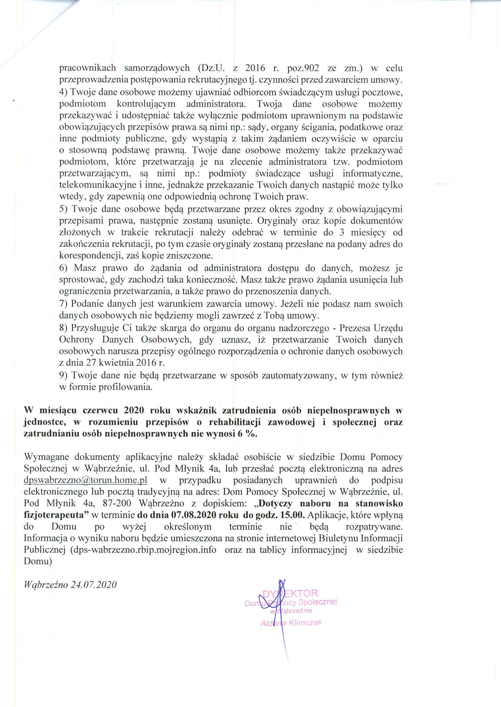 Wymagane dokumenty aplikacyjne należy składać osobiście w siedzibie Domu Pomocy Społecznej w Wąbrzeźnie, ul. Pod Młynik 4a, lub przesłać pocztą elektroniczną na adres dpswabrzezno[at]torun[dot]home[dot]pl w przypadku posiadanych uprawnień do podpisu elektronicznego lub pocztą tradycyjną na adres: Dom Pomocy Społecznej w Wąbrzeźnie, ul. Pod Młynik 4a, 87-200 Wąbrzeźno z dopiskiem: „Dotyczy naboru na stanowisko fizjoterapeuta” w terminie do dnia 07.08.2020 roku  do godz. 15.00. Aplikacje, które wpłyną do Domu po wyżej określonym terminie nie będą rozpatrywane.