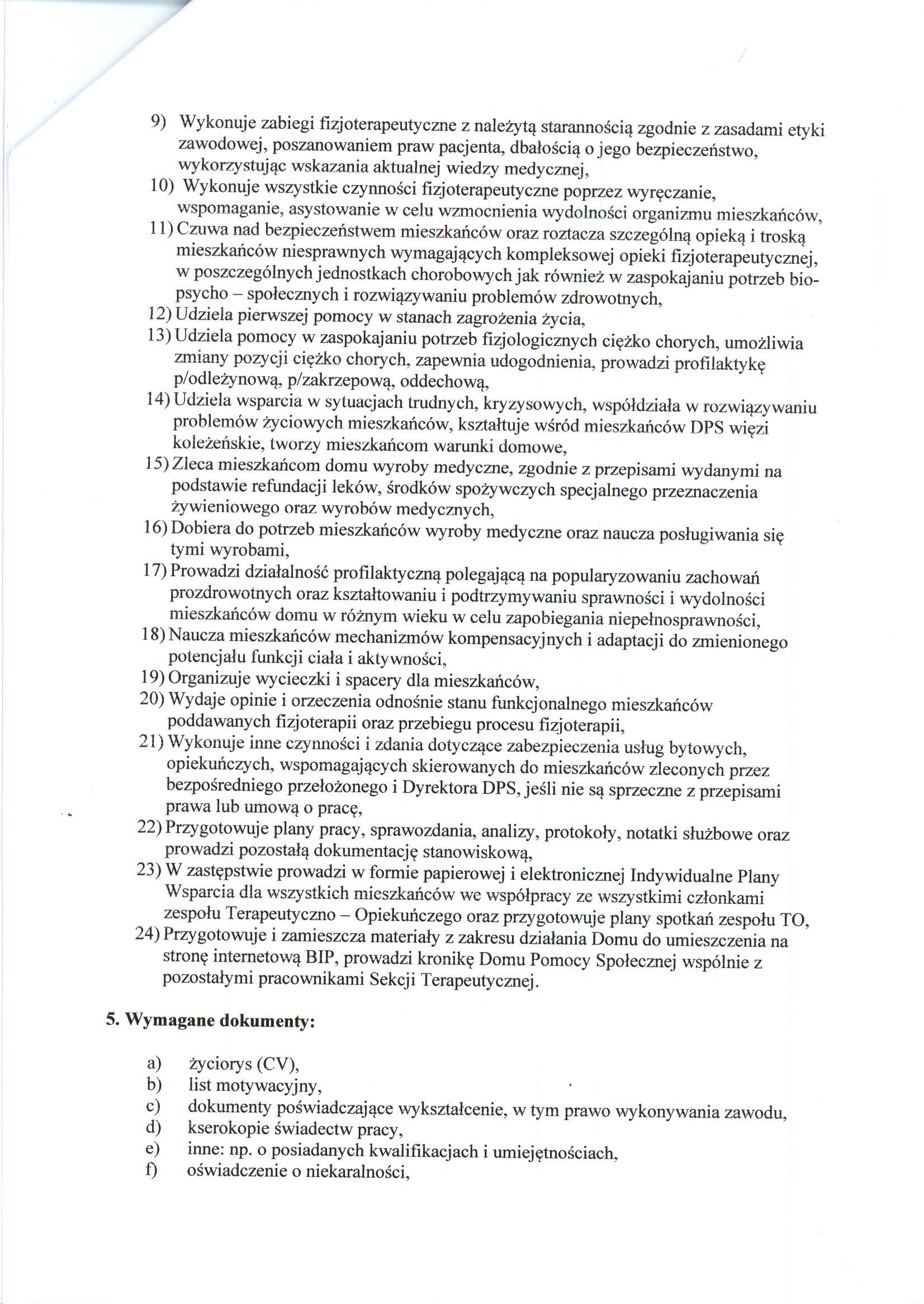 - Czuwa nad bezpieczeństwem mieszkańców oraz roztacza szczególną opieką i troską mieszkańców niesprawnych wymagających kompleksowej opieki fizjoterapeutycznej, w poszczególnych jednostkach chorobowych jak również w zaspokajaniu potrzeb bio- psycho – społecznych i rozwiązywaniu problemów zdrowotnych,