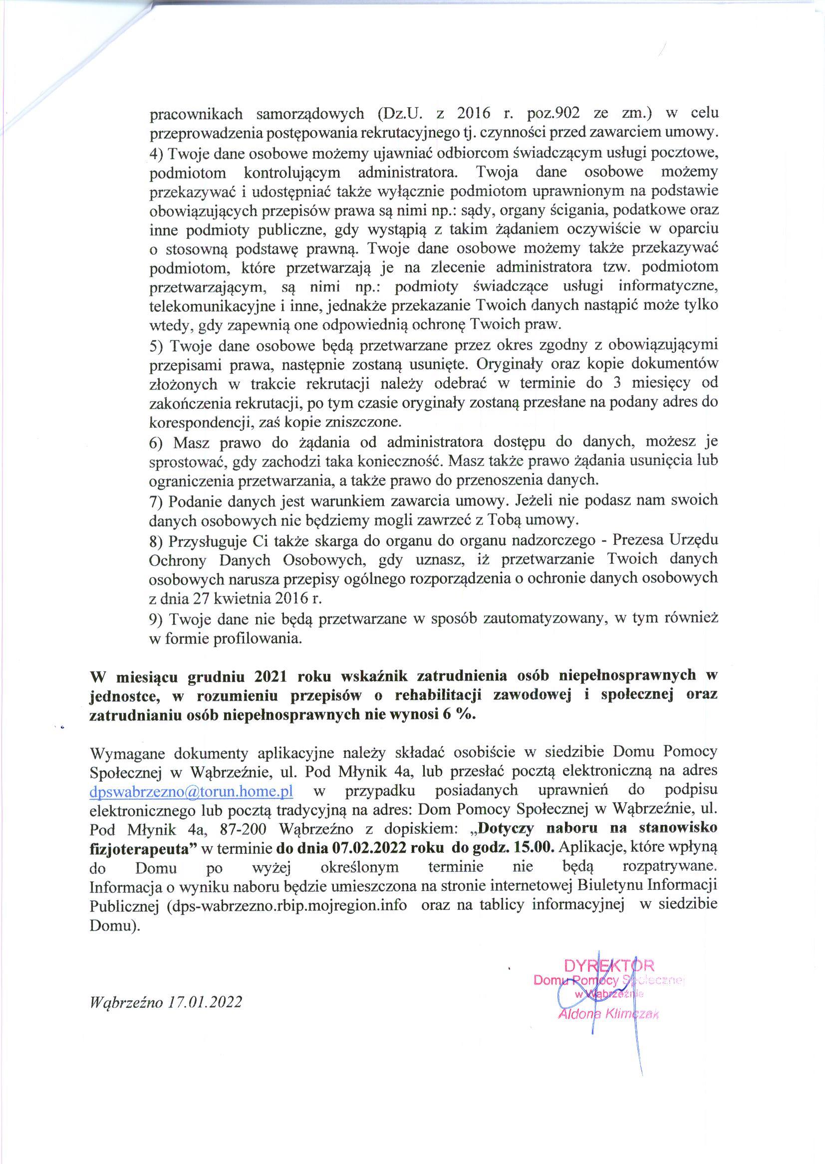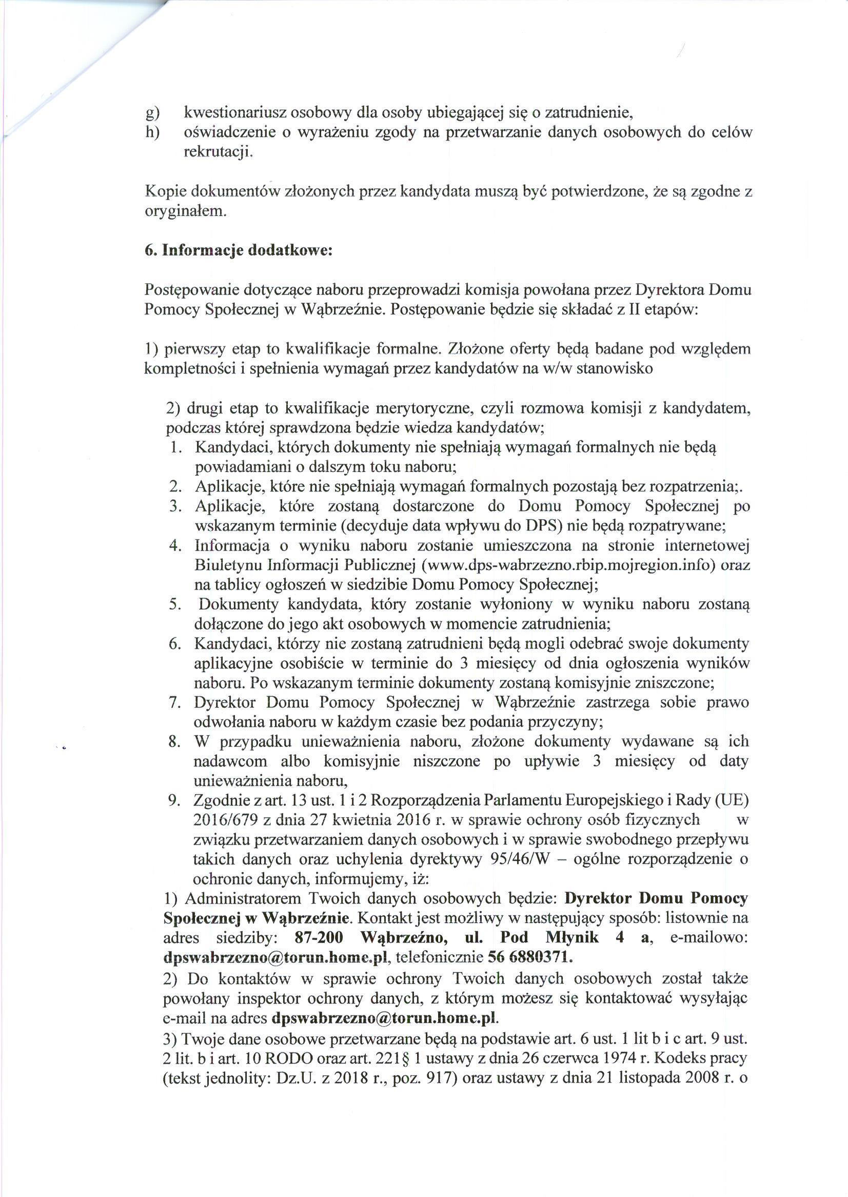 - Dyrektor Domu Pomocy Społecznej w Wąbrzeźnie zastrzega sobie prawo odwołania naboru w każdym czasie bez podania przyczyny;