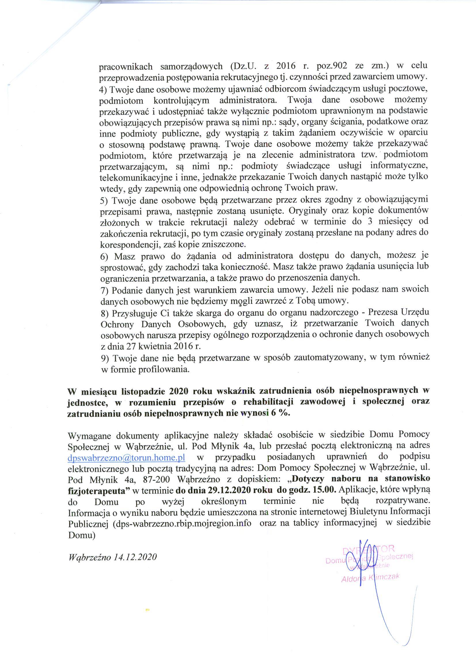- Dyrektor Domu Pomocy Społecznej w Wąbrzeźnie zastrzega sobie prawo odwołania naboru w każdym czasie bez podania przyczyny;