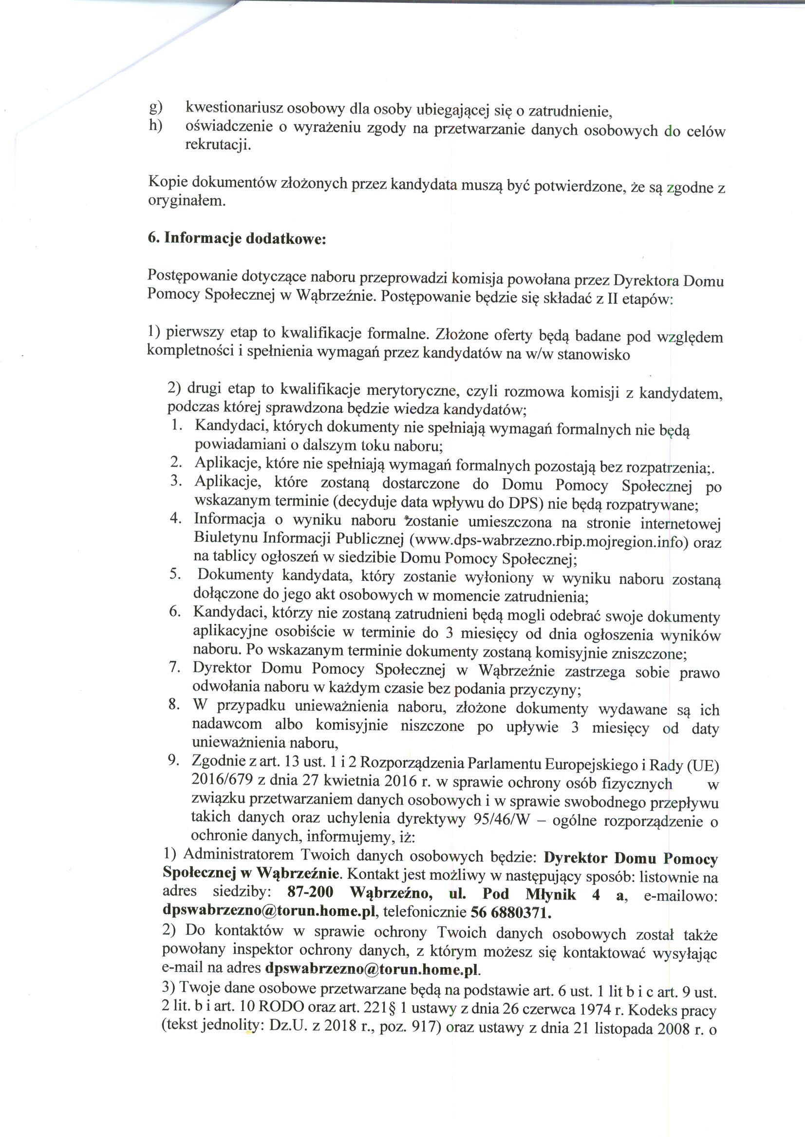 - Dyrektor Domu Pomocy Społecznej w Wąbrzeźnie zastrzega sobie prawo odwołania naboru w każdym czasie bez podania przyczyny;