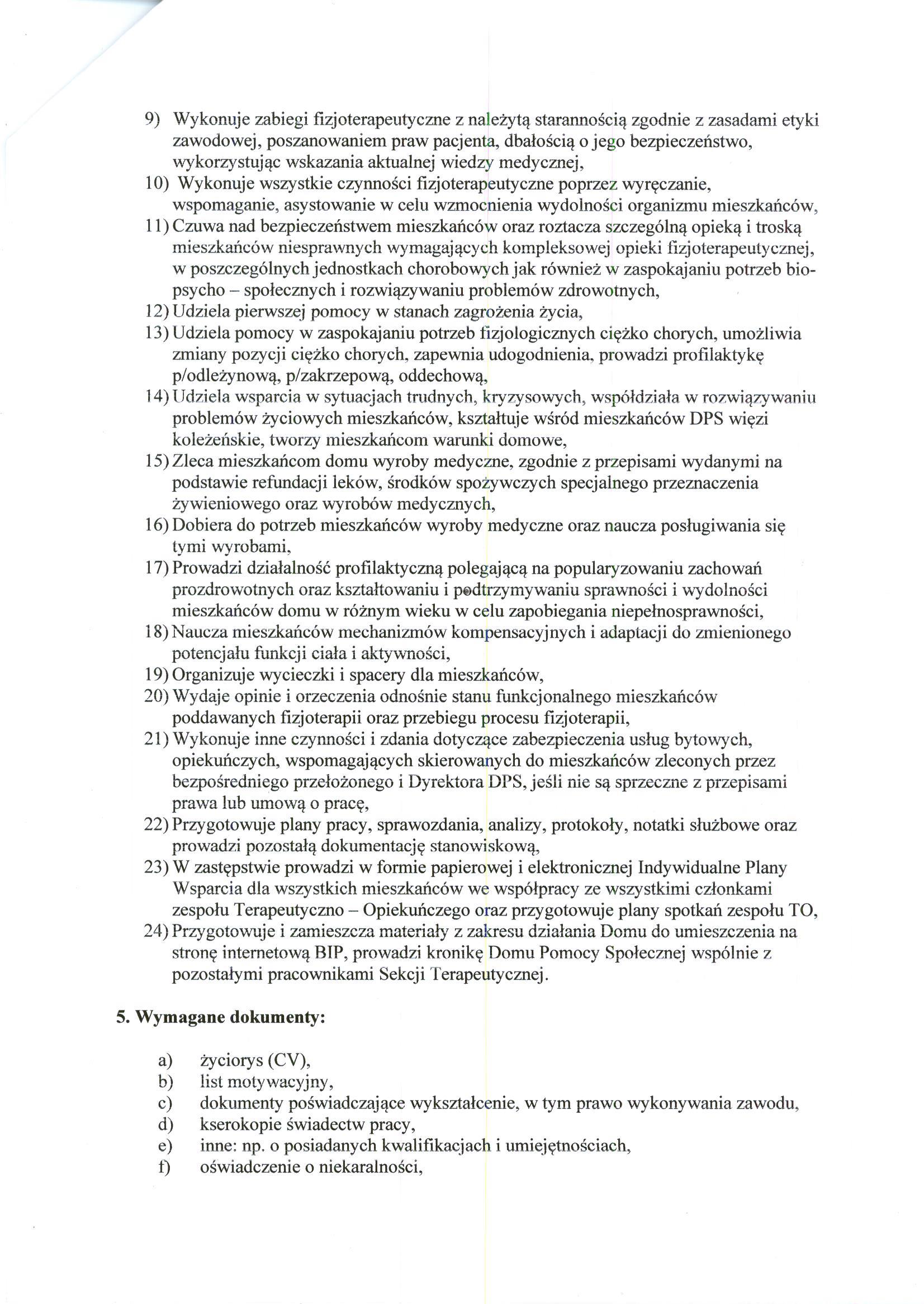 - Czuwa nad bezpieczeństwem mieszkańców oraz roztacza szczególną opieką i troską mieszkańców niesprawnych wymagających kompleksowej opieki fizjoterapeutycznej, w poszczególnych jednostkach chorobowych jak również w zaspokajaniu potrzeb bio- psycho – społecznych i rozwiązywaniu problemów zdrowotnych,
