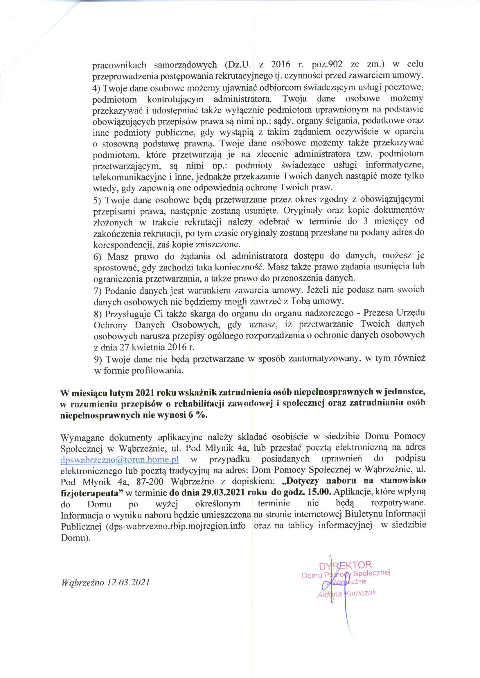- Dyrektor Domu Pomocy Społecznej w Wąbrzeźnie zastrzega sobie prawo odwołania naboru w każdym czasie bez podania przyczyny;