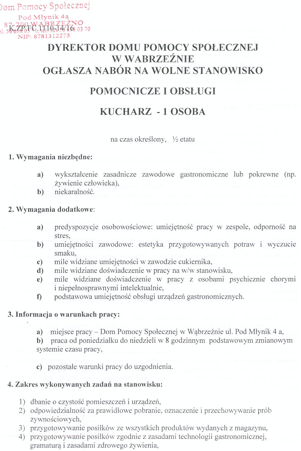 OGŁASZA NABÓR NA WOLNE STANOWISKO POMOCNICZE I OBSŁUGI – KUCHARZ – 1 OSOBA