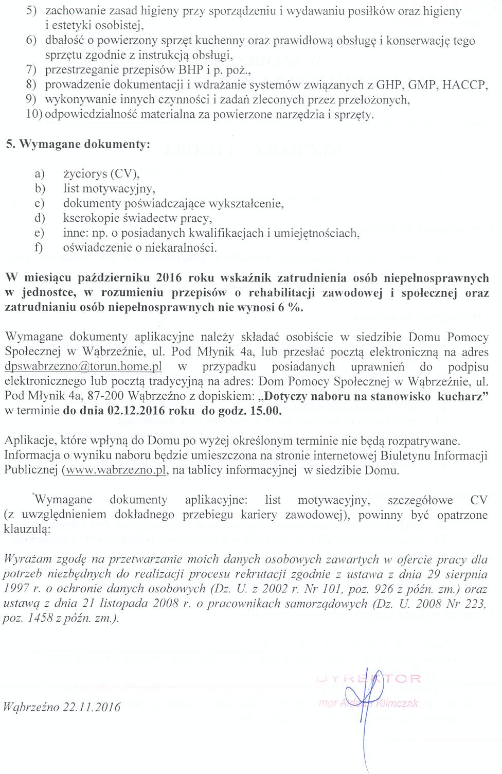 Wymagane dokumenty aplikacyjne należy składać osobiście w siedzibie Domu Pomocy Społecznej w Wąbrzeźnie, ul. Pod Młynik 4a, lub przesłać pocztą elektroniczną na adres dpswabrzezno[at]torun[dot]home[dot]pl w przypadku posiadanych uprawnień do podpisu elektronicznego lub pocztą tradycyjną na adres: Dom Pomocy Społecznej w Wąbrzeźnie, ul. Pod Młynik 4a, 87-200 Wąbrzeźno z dopiskiem: „Dotyczy naboru na stanowisko kucharz” w terminie do dnia 02.12.2016 roku do godz. 15.00.
