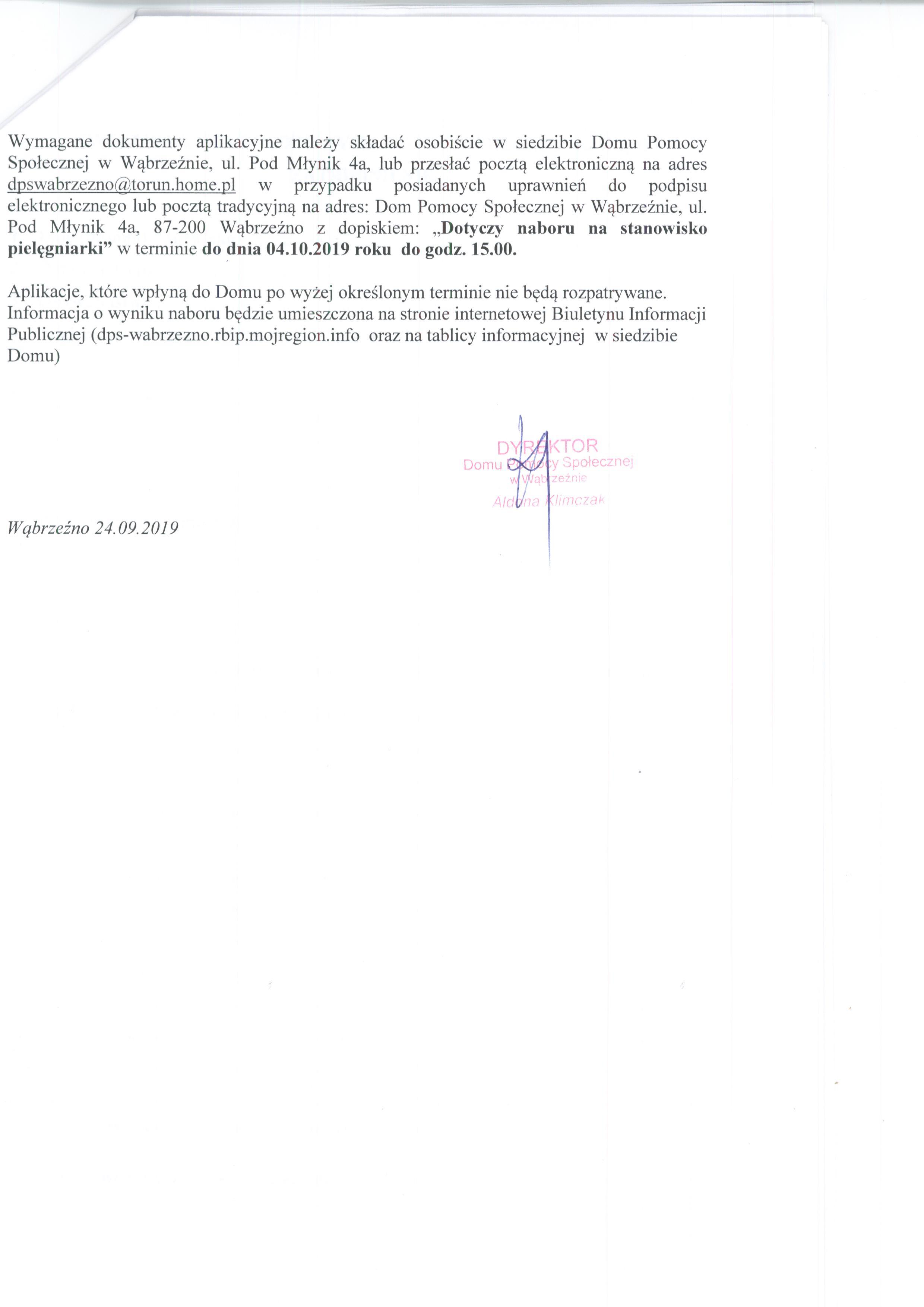 Wymagane dokumenty aplikacyjne należy składać osobiście w siedzibie Domu Pomocy Społecznej w Wąbrzeźnie, ul. Pod Młynik 4a, lub przesłać pocztą elektroniczną na adres dpswabrzezno[at]torun[dot]home[dot]pl w przypadku posiadanych uprawnień do podpisu elektronicznego lub pocztą tradycyjną na adres: Dom Pomocy Społecznej w Wąbrzeźnie, ul. Pod Młynik 4a, 87-200 Wąbrzeźno z dopiskiem: „Dotyczy naboru na stanowisko pielęgniarki” w terminie do dnia 04.10.2019 roku do godz. 15.00.