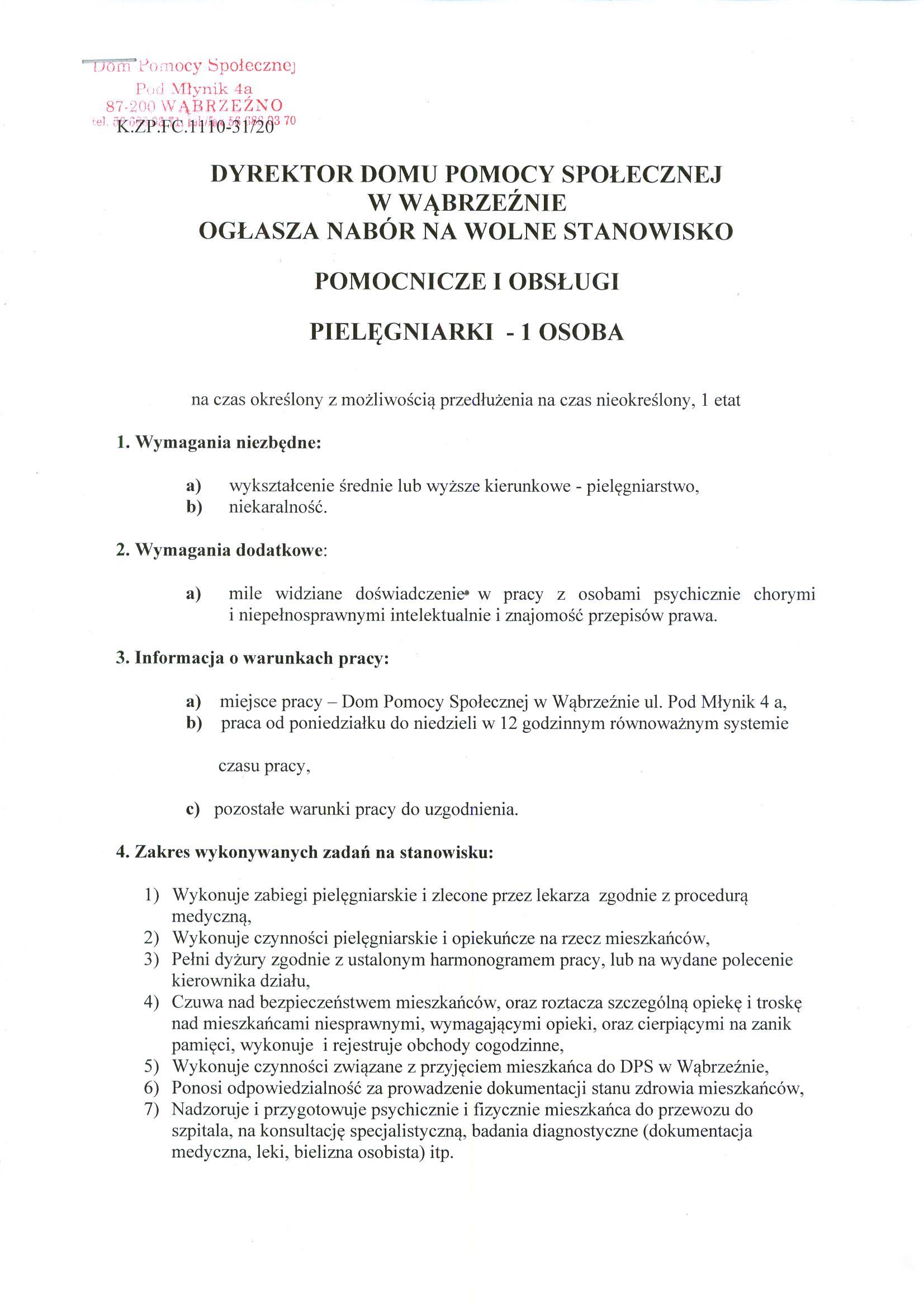 Nabór na wolne stanowisko pomocnicze i obsługi – pielęgniarki w Domu Pomocy Społecznej w Wąbrzeźnie