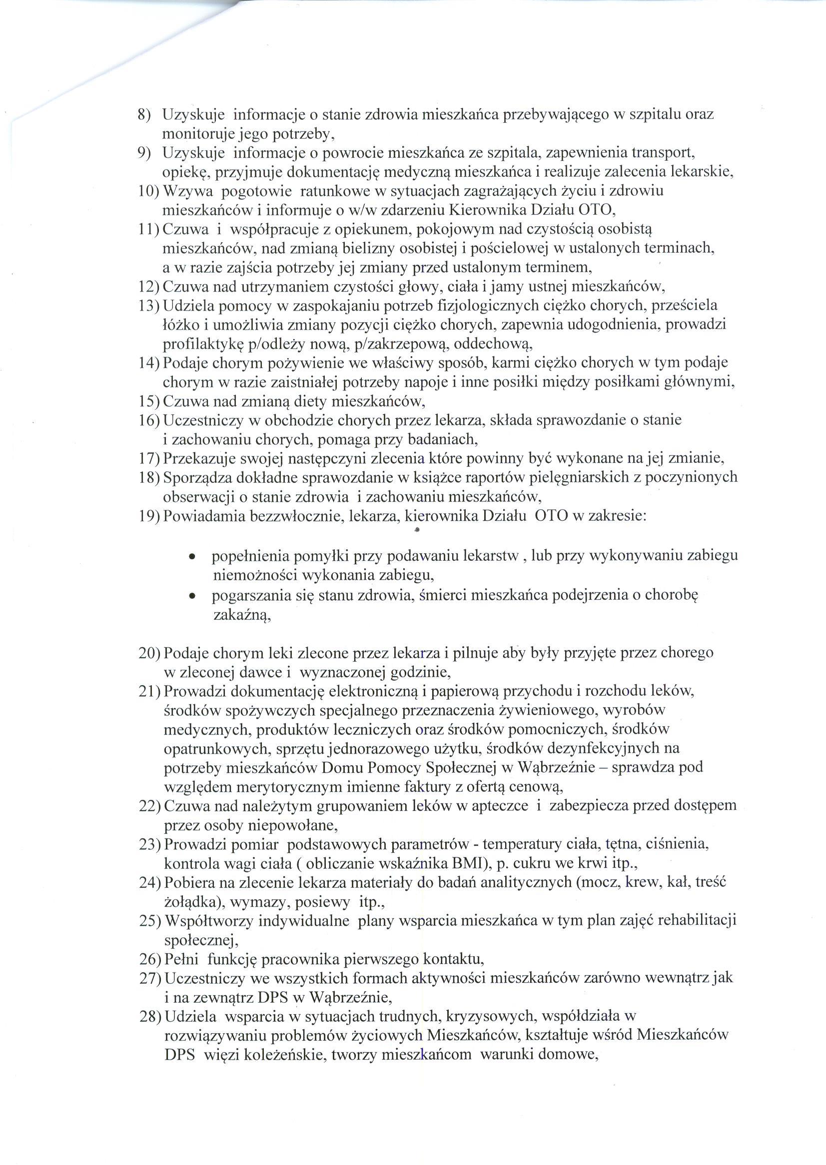 • Sporządza dokładne sprawozdanie w książce raportów pielęgniarskich z poczynionych obserwacji o stanie zdrowia i zachowaniu mieszkańców,