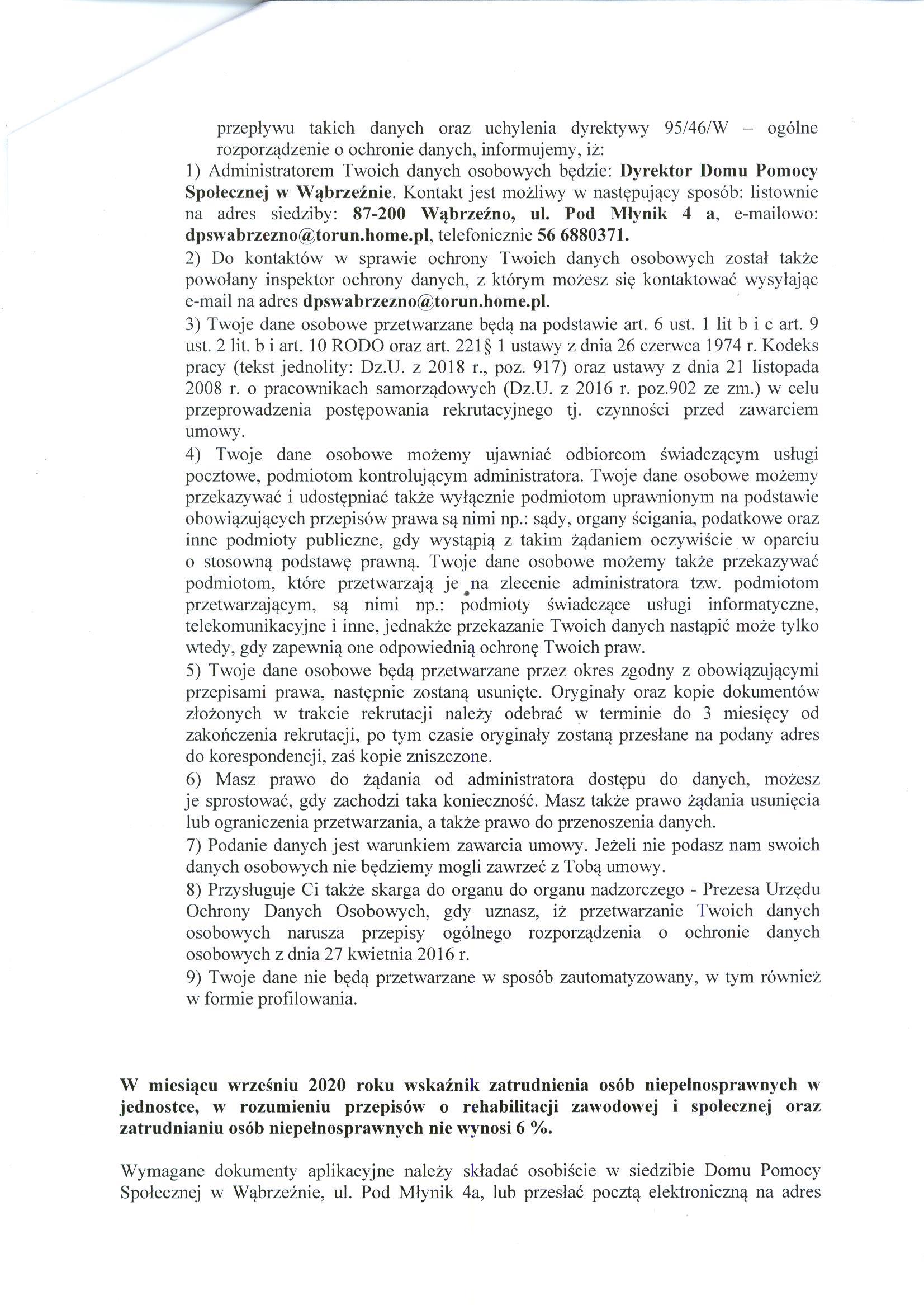 6. Dyrektor Domu Pomocy Społecznej w Wąbrzeźnie zastrzega sobie prawo odwołania naboru w każdym czasie bez podania przyczyny;