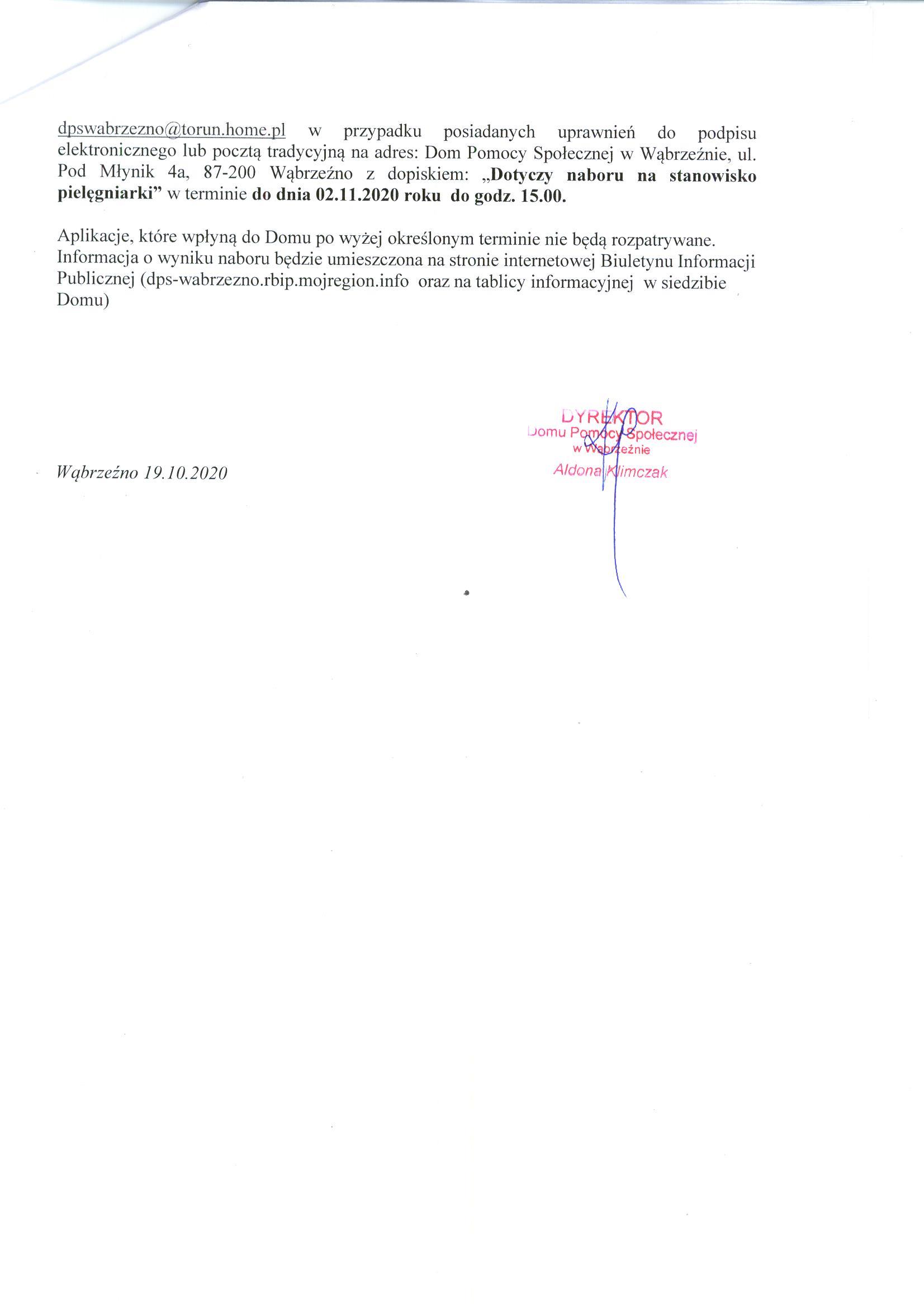 Wymagane dokumenty aplikacyjne należy składać osobiście w siedzibie Domu Pomocy Społecznej w Wąbrzeźnie, ul. Pod Młynik 4a, lub przesłać pocztą elektroniczną na adres dpswabrzezno[at]torun[dot]home[dot]pl w przypadku posiadanych uprawnień do podpisu elektronicznego lub pocztą tradycyjną na adres: Dom Pomocy Społecznej w Wąbrzeźnie, ul. Pod Młynik 4a, 87-200 Wąbrzeźno z dopiskiem: „Dotyczy naboru na stanowisko pielęgniarki” w terminie do dnia 02.11.2020 roku  do godz. 15.00.
