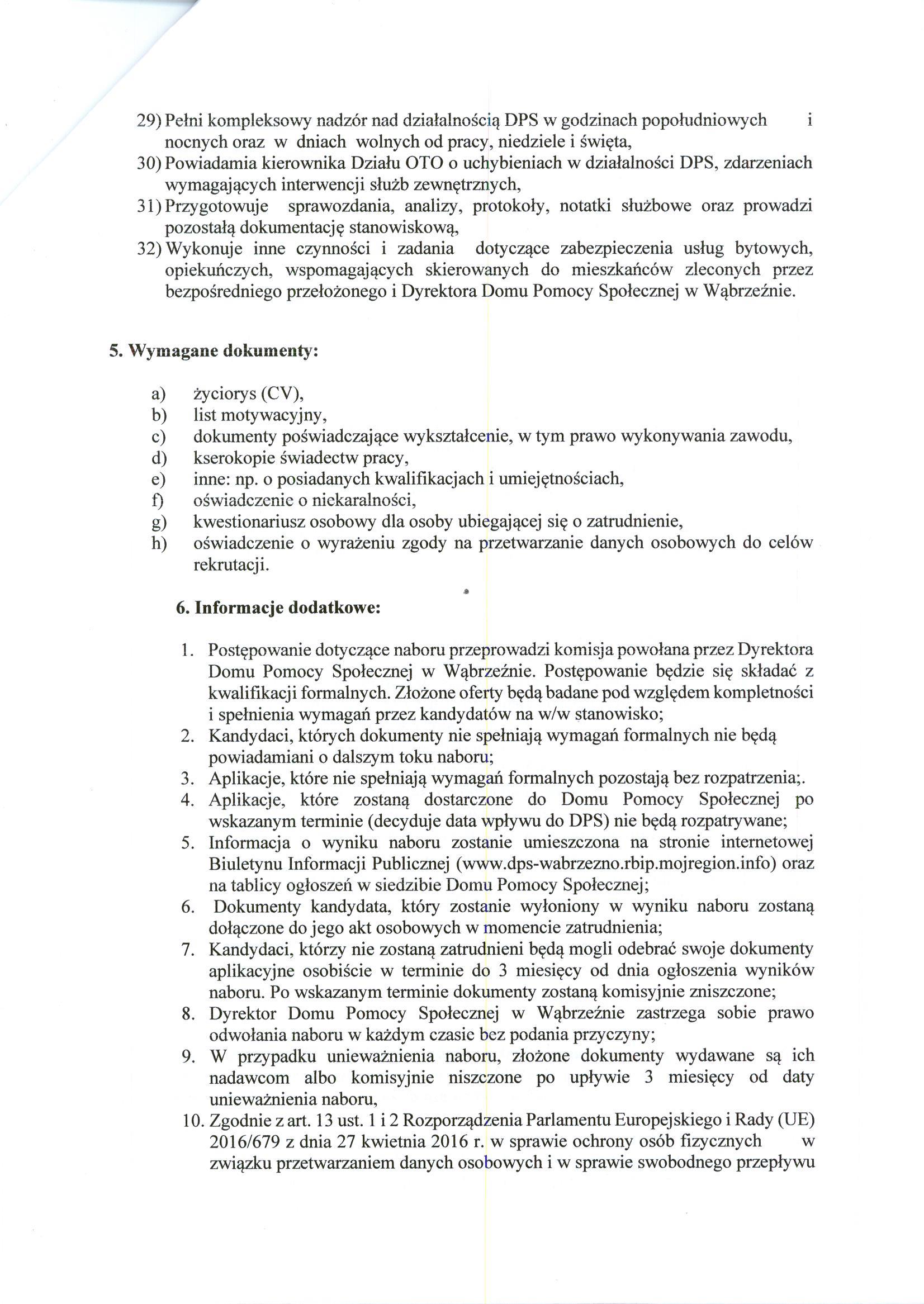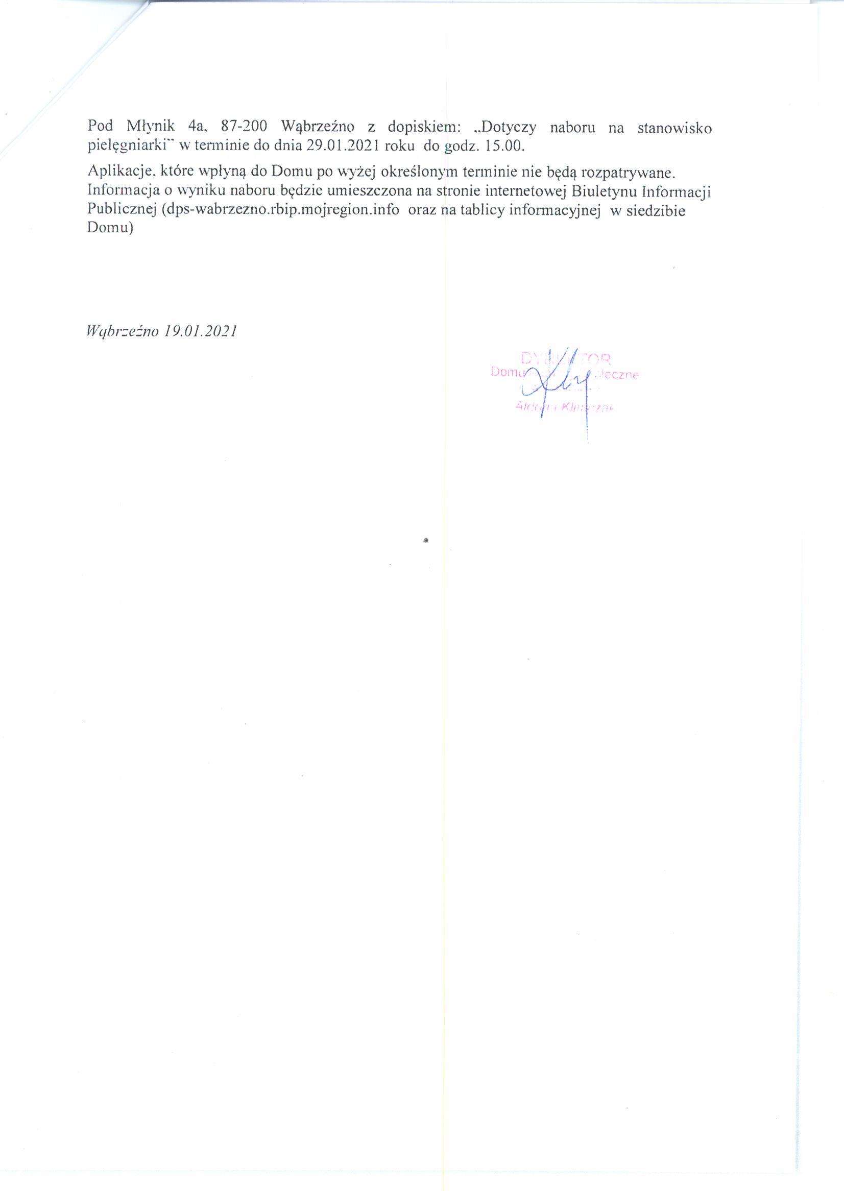 Informacja o wyniku naboru będzie umieszczona na stronie internetowej Biuletynu Informacji Publicznej (dps-wabrzezno.rbip.mojregion.info oraz na tablicy informacyjnej w siedzibie Domu)