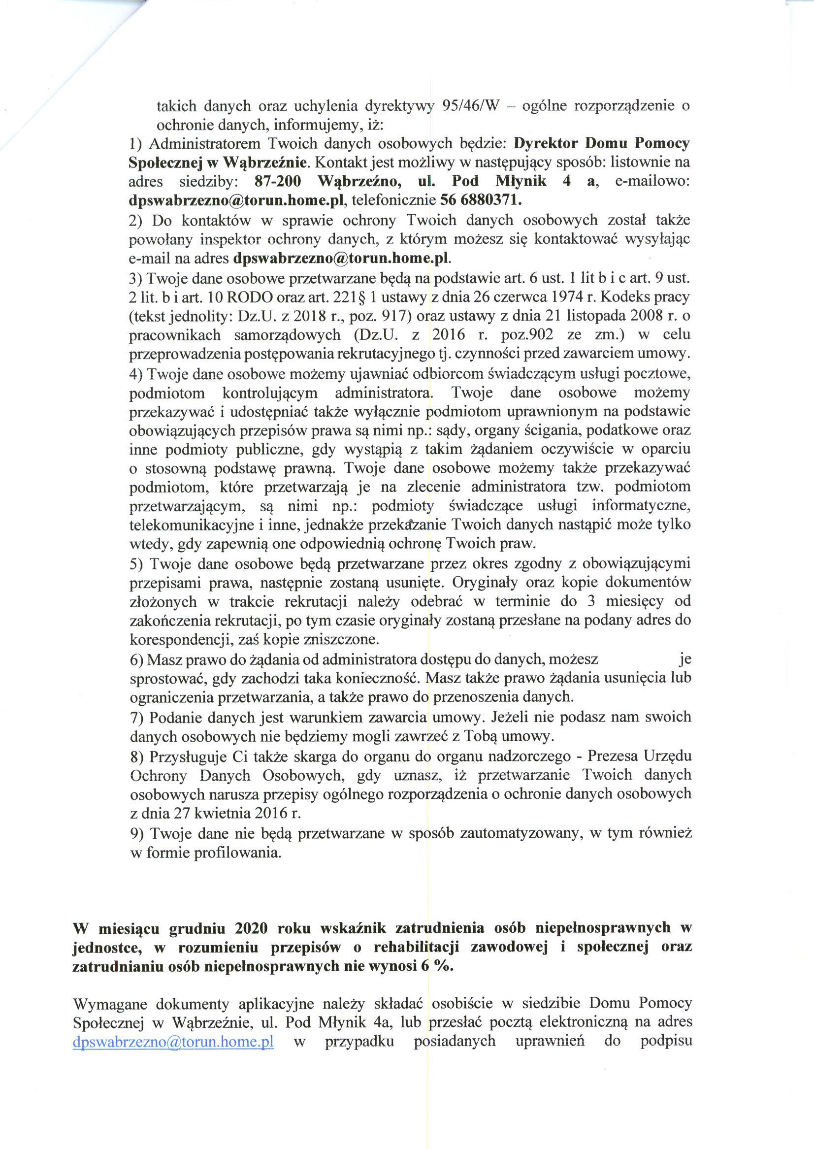 8. Dyrektor Domu Pomocy Społecznej w Wąbrzeźnie zastrzega sobie prawo odwołania naboru w każdym czasie bez podania przyczyny;