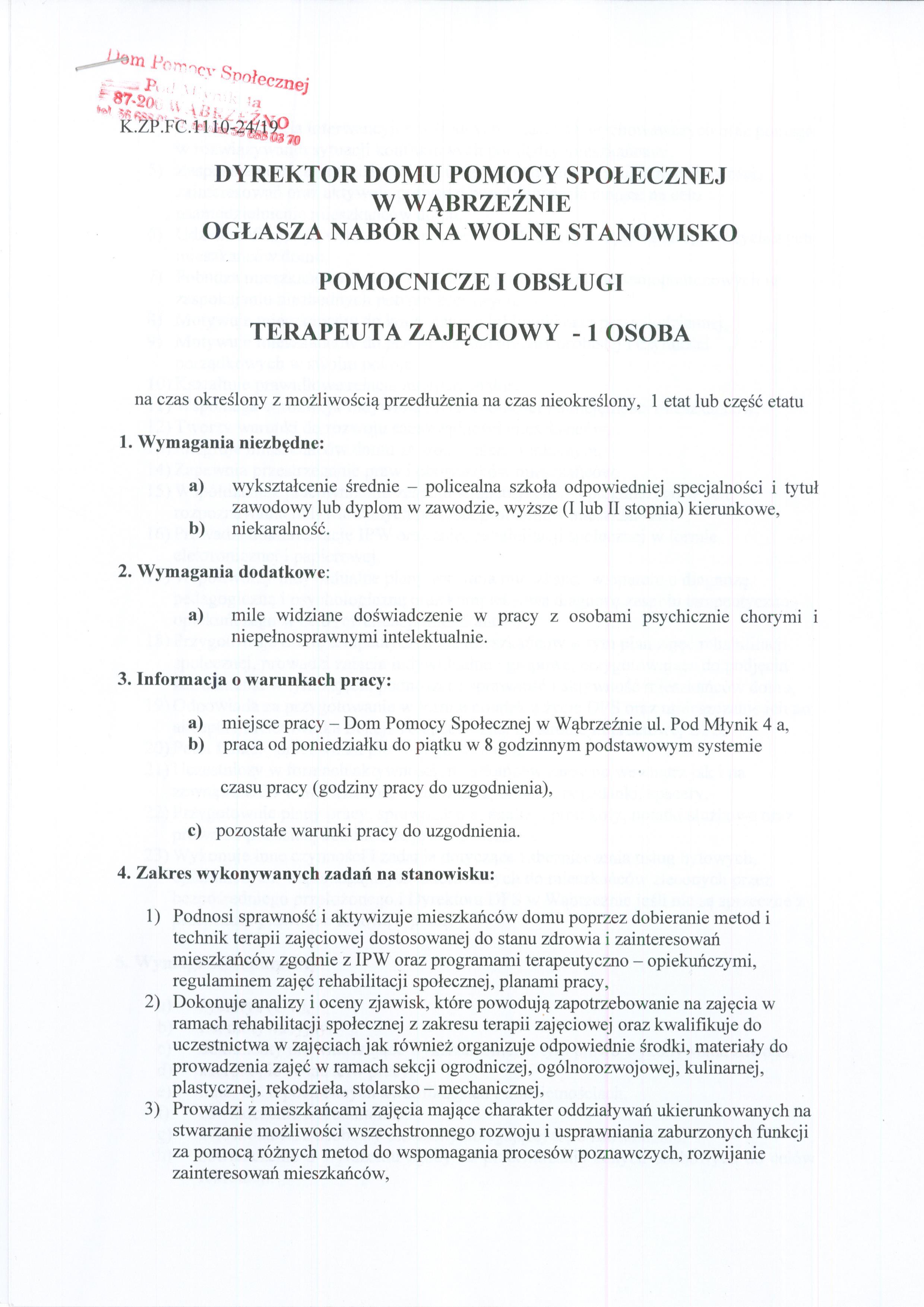 Wymagane dokumenty aplikacyjne należy składać osobiście w siedzibie Domu Pomocy Społecznej w Wąbrzeźnie, ul. Pod Młynik 4a, lub przesłać pocztą elektroniczną na adres dpswabrzezno[at]torun[dot]home[dot]pl w przypadku posiadanych uprawnień do podpisu elektronicznego lub pocztą tradycyjną na adres: Dom Pomocy Społecznej w Wąbrzeźnie, ul. Pod Młynik 4a, 87-200 Wąbrzeźno z dopiskiem: „Dotyczy naboru na stanowisko terapeuta zajęciowy” w terminie do dnia 11.10.2019 roku do godz. 15.00.
