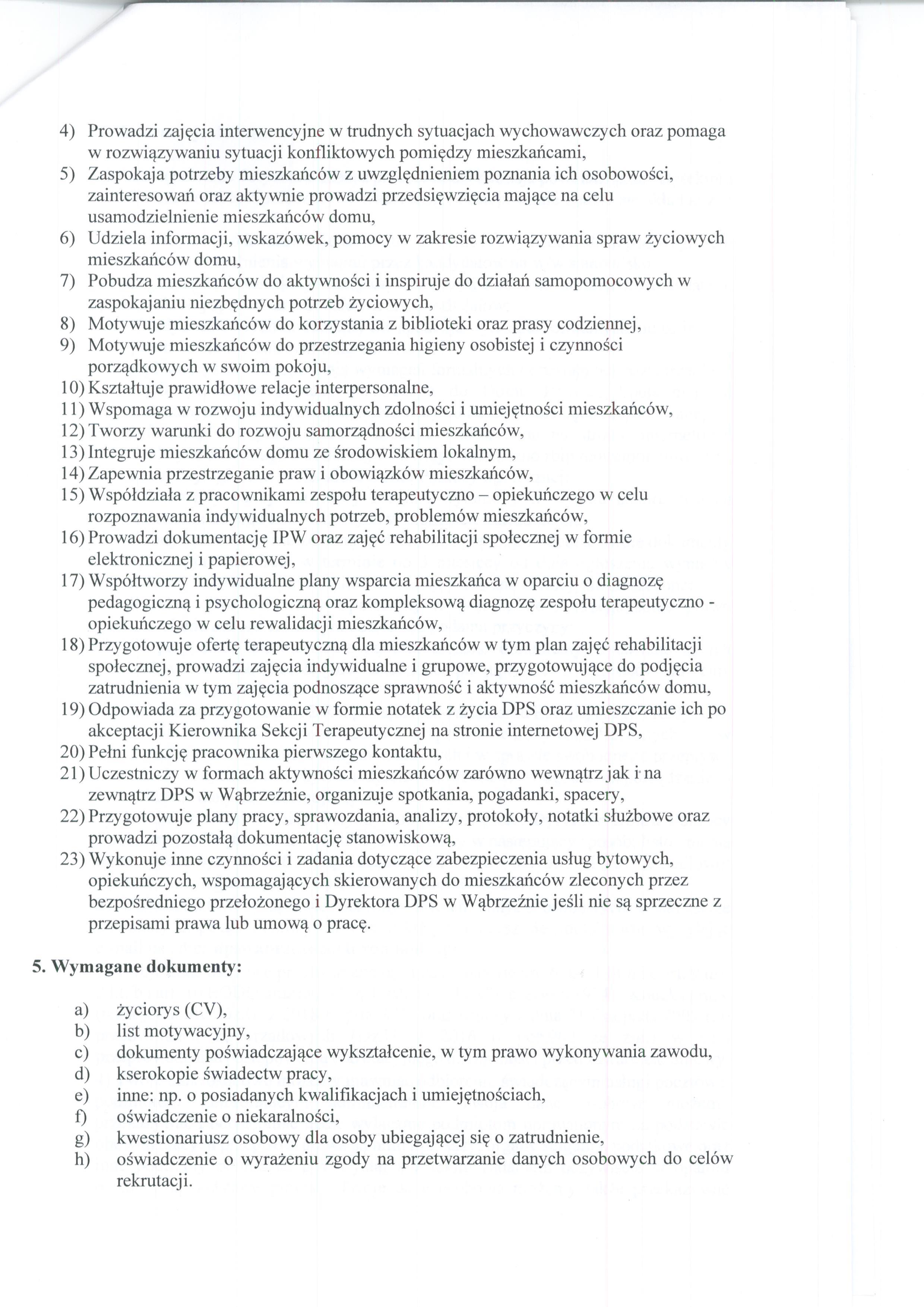 - Wykonuje inne czynności i zadania dotyczące zabezpieczenia usług bytowych, opiekuńczych, wspomagających skierowanych do mieszkańców zleconych przez bezpośredniego przełożonego i Dyrektora DPS w Wąbrzeźnie jeśli nie są sprzeczne z przepisami prawa lub umową o pracę.