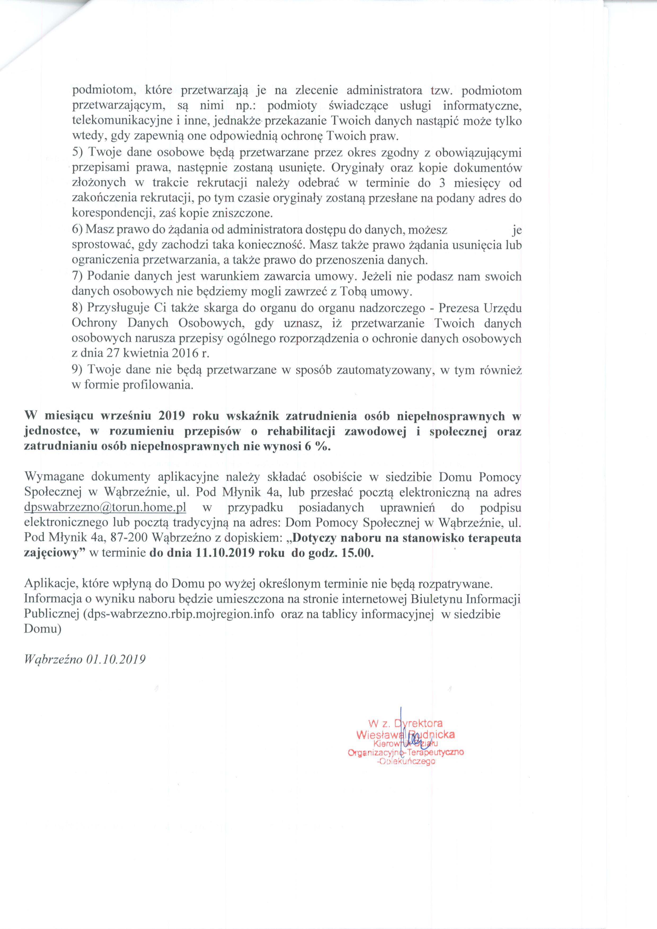 - Dyrektor Domu Pomocy Społecznej w Wąbrzeźnie zastrzega sobie prawo odwołania naboru w każdym czasie bez podania przyczyny;