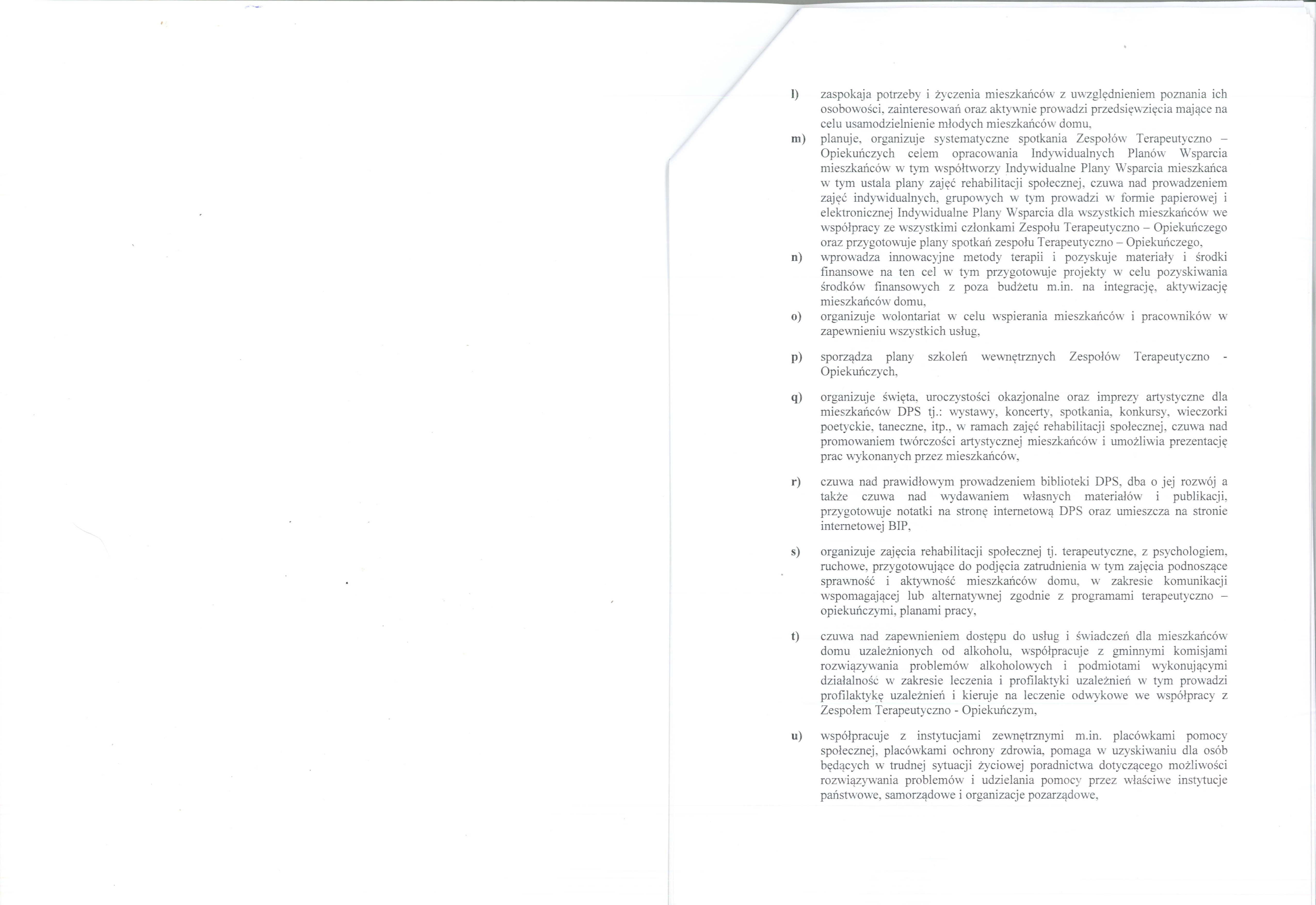 20. czuwa nad zapewnieniem dostępu do usług i świadczeń dla mieszkańców domu uzależnionych od alkoholu, współpracuje z gminnymi komisjami rozwiązywania problemów alkoholowych i podmiotami wykonującymi działalność w zakresie leczenia i profilaktyki uzależnień w tym prowadzi profilaktykę uzależnień i kieruje na leczenie odwykowe we współpracy z Zespołem Terapeutyczno – Opiekuńczym,