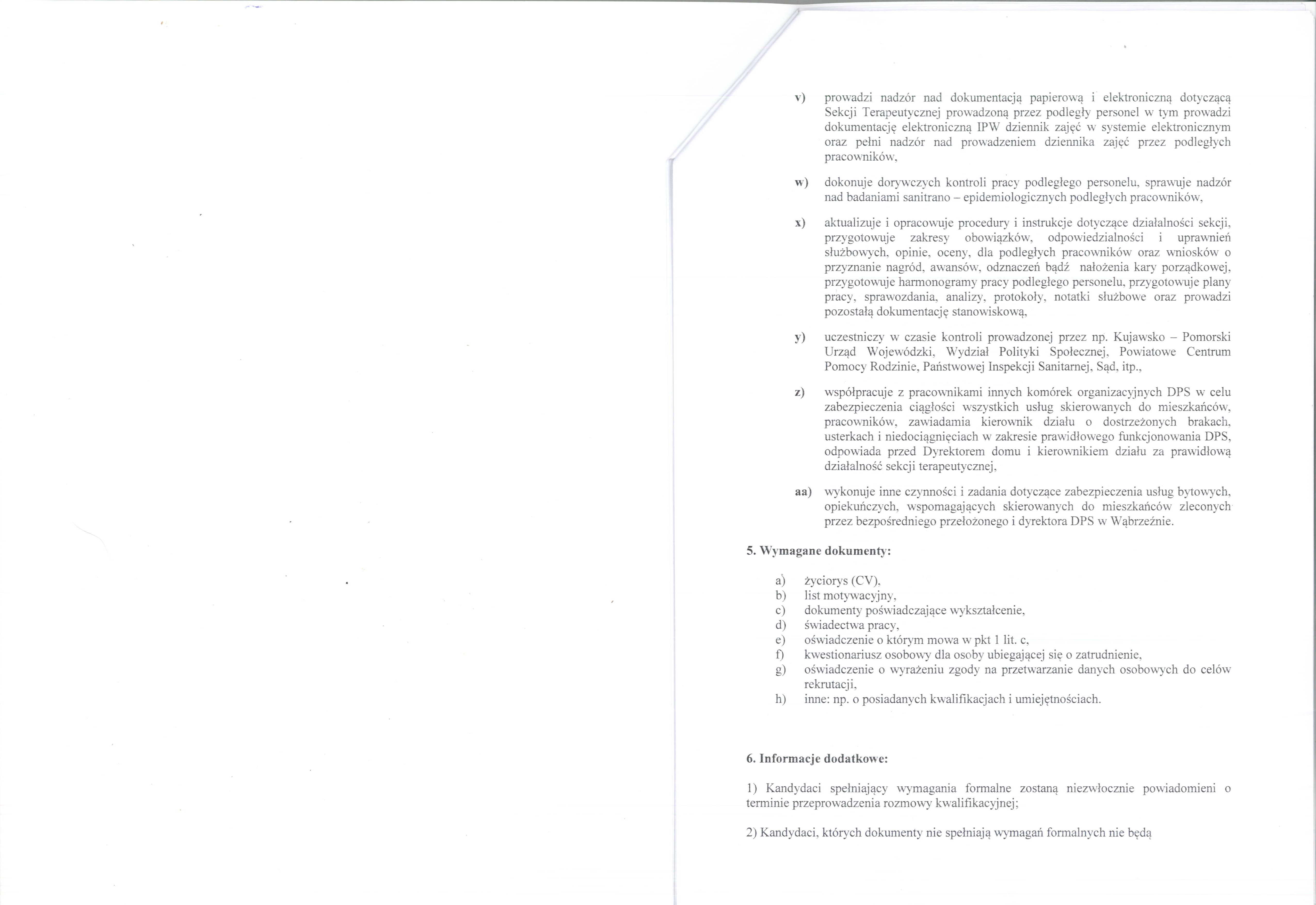 Wymagane dokumenty aplikacyjne należy składać osobiście w siedzibie Domu Pomocy Społecznej w Wąbrzeźnie, ul. Pod Młynik 4a,  pocztą elektroniczną na adres dpswabrzezno[at]torun[dot]home[dot]pl w przypadku posiadanych uprawnień do podpisu elektronicznego lub pocztą na adres: Dom Pomocy Społecznej w Wąbrzeźnie, ul. Pod Młynik 4a, 87-200 Wąbrzeźno z dopiskiem: „Dotyczy naboru na stanowisko kierownika sekcji terapeutycznej ” w terminie do dnia 13.03.2019 roku do godz. 15.00.