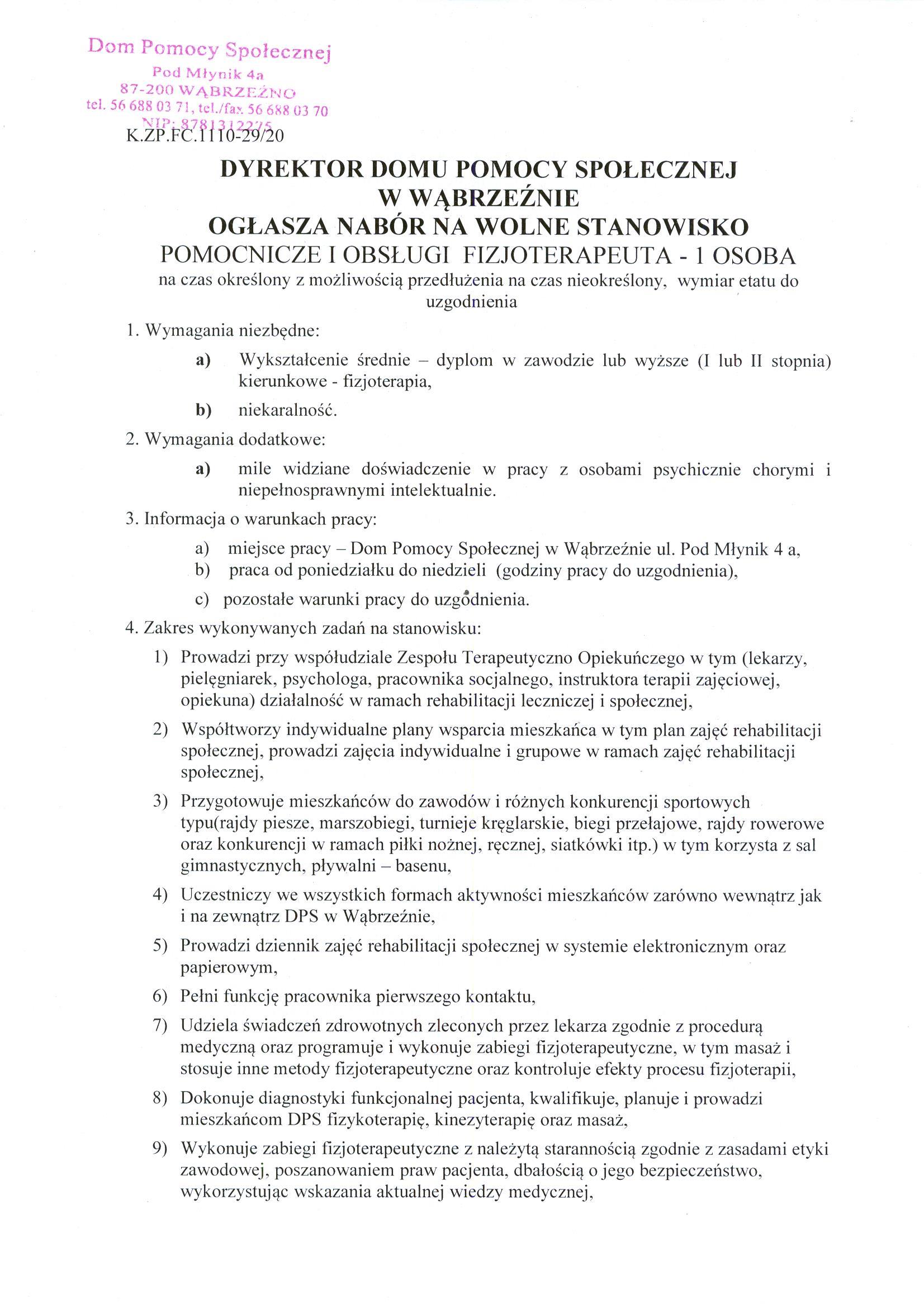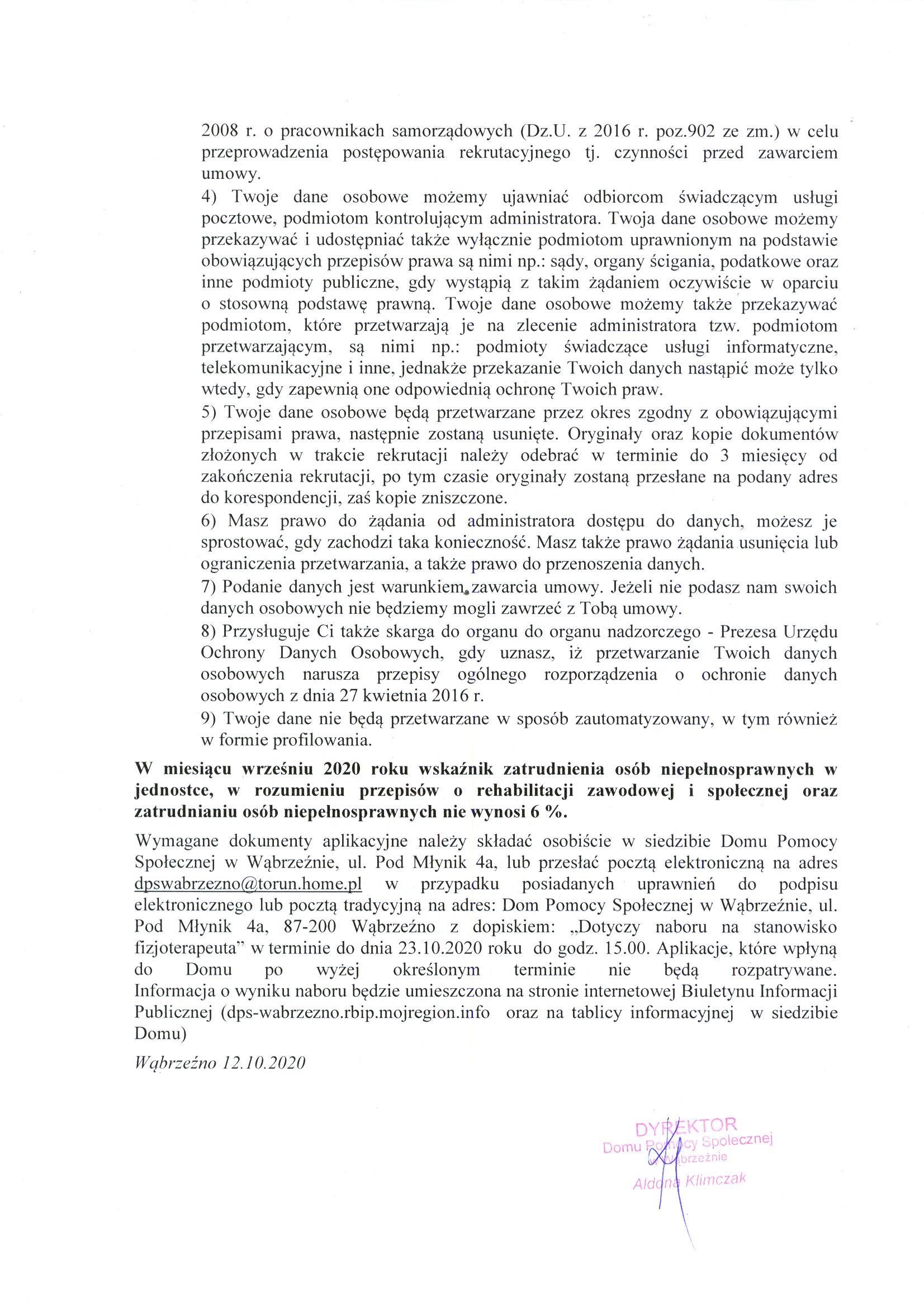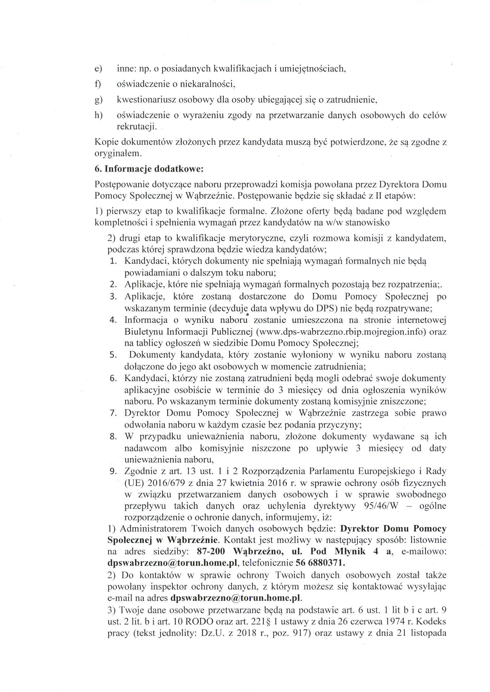 - Dyrektor Domu Pomocy Społecznej w Wąbrzeźnie zastrzega sobie prawo odwołania naboru w każdym czasie bez podania przyczyny;