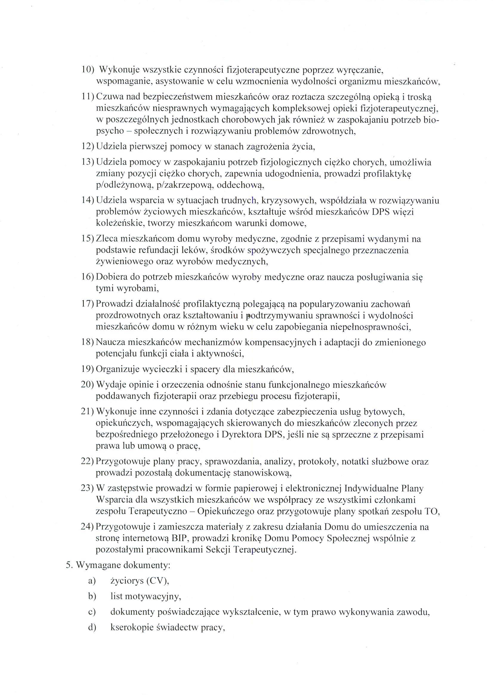 - Czuwa nad bezpieczeństwem mieszkańców oraz roztacza szczególną opieką i troską mieszkańców niesprawnych wymagających kompleksowej opieki fizjoterapeutycznej, w poszczególnych jednostkach chorobowych jak również w zaspokajaniu potrzeb bio- psycho – społecznych i rozwiązywaniu problemów zdrowotnych,