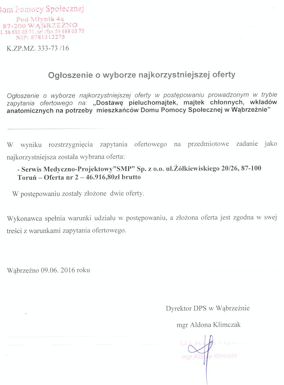 Ogłoszenie o wyborze najkorzystniejszej oferty w postępowaniu prowadzonym w trybie zapytania ofertowego na: „Dostawę pieluchomajtek, majtek chłonnych, wkładów anatomicznych na potrzeby mieszkańców Domu Pomocy Społecznej w Wąbrzeźnie”