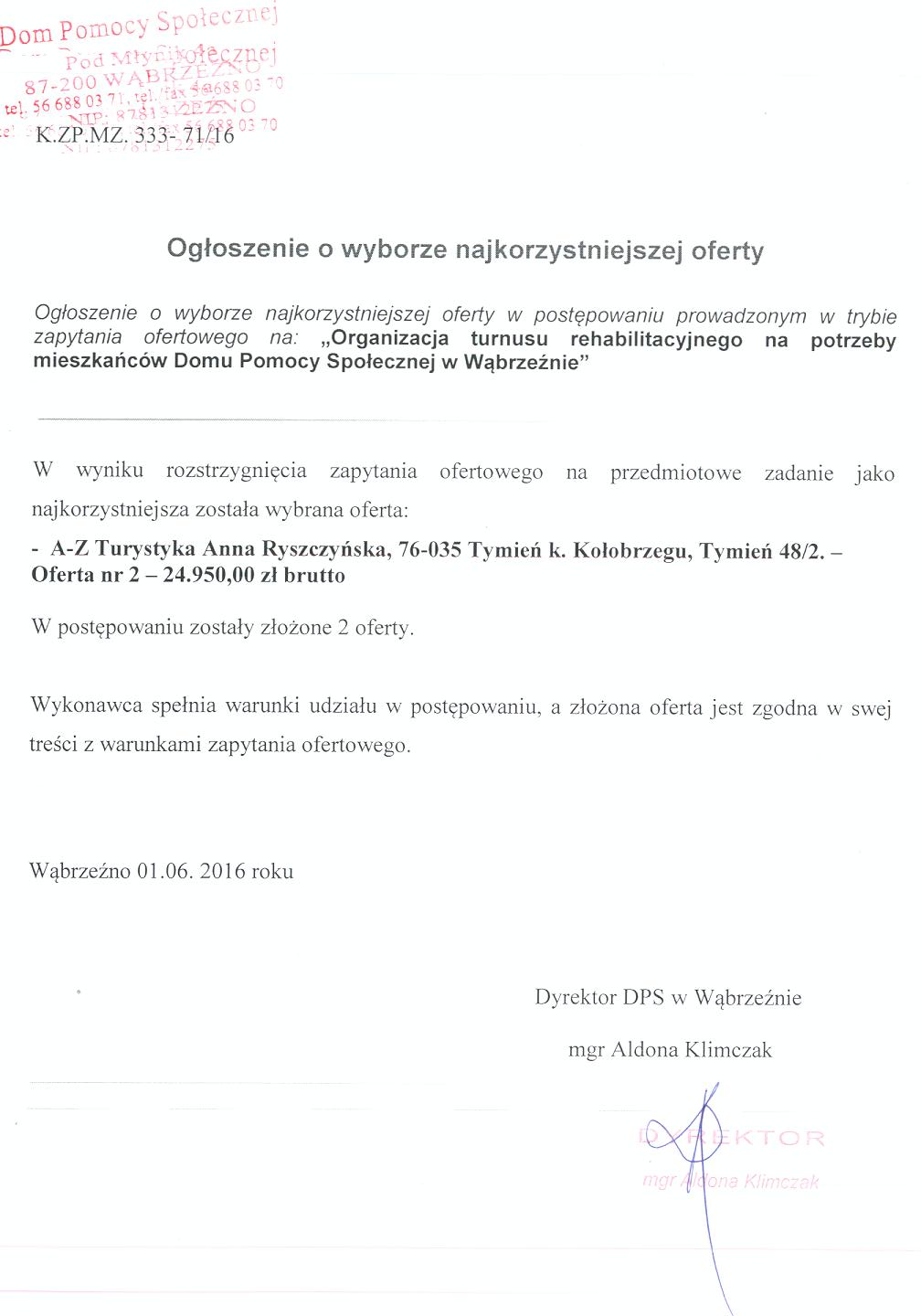 Ogłoszenie o wyborze najkorzystniejszej oferty w postępowaniu prowadzonym w trybie zapytania ofertowego na: „Organizacja turnusu rehabilitacyjnego na potrzeby mieszkańców Domu Pomocy Społecznej w Wąbrzeźnie”