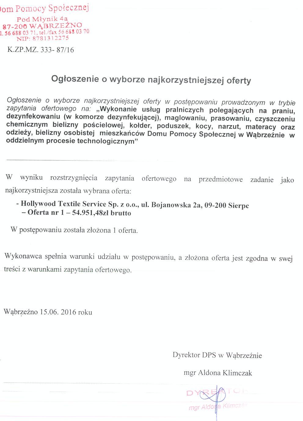| utworzono: | data: 10:46, 16.06.2016 | przez: Redaktor DPS | Ogłoszenie o wyborze najkorzystniejszej oferty na usługi pralnicze |