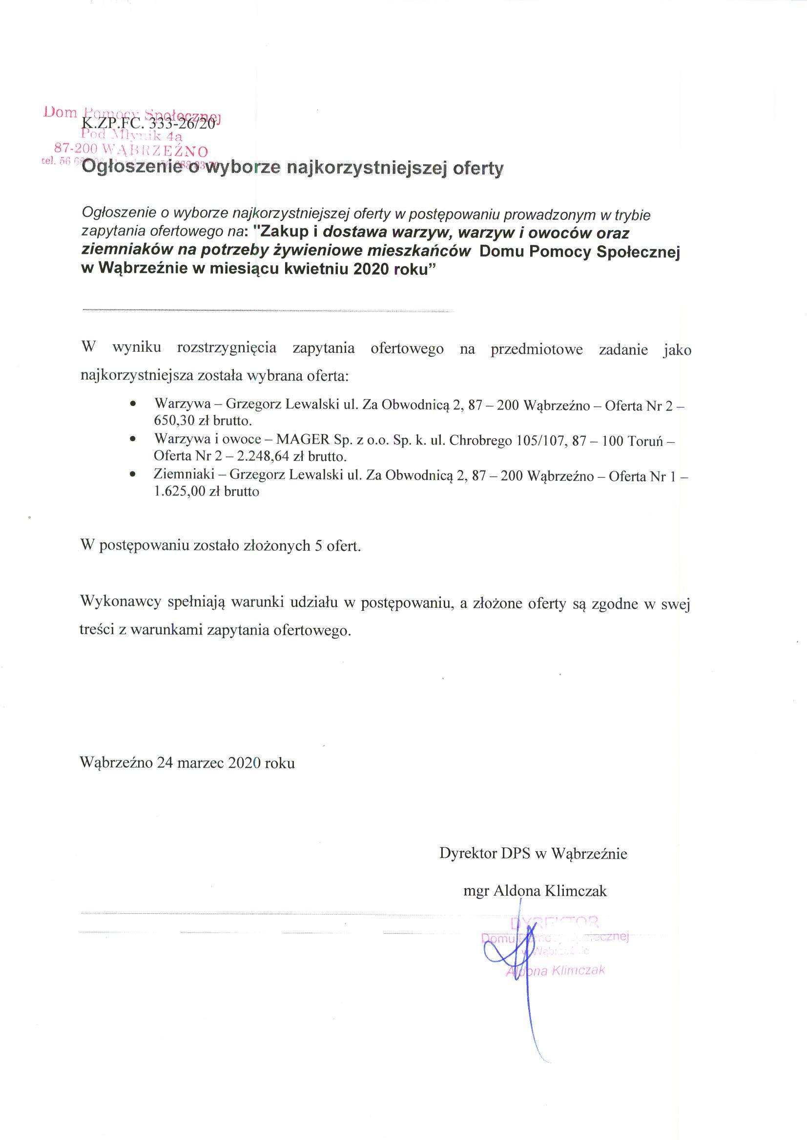 „Zakup i dostawa warzyw, warzyw i owoców oraz ziemniaków na potrzeby żywieniowe mieszkańców Domu Pomocy Społecznej w Wąbrzeźnie w miesiącu kwietniu 2020 roku”