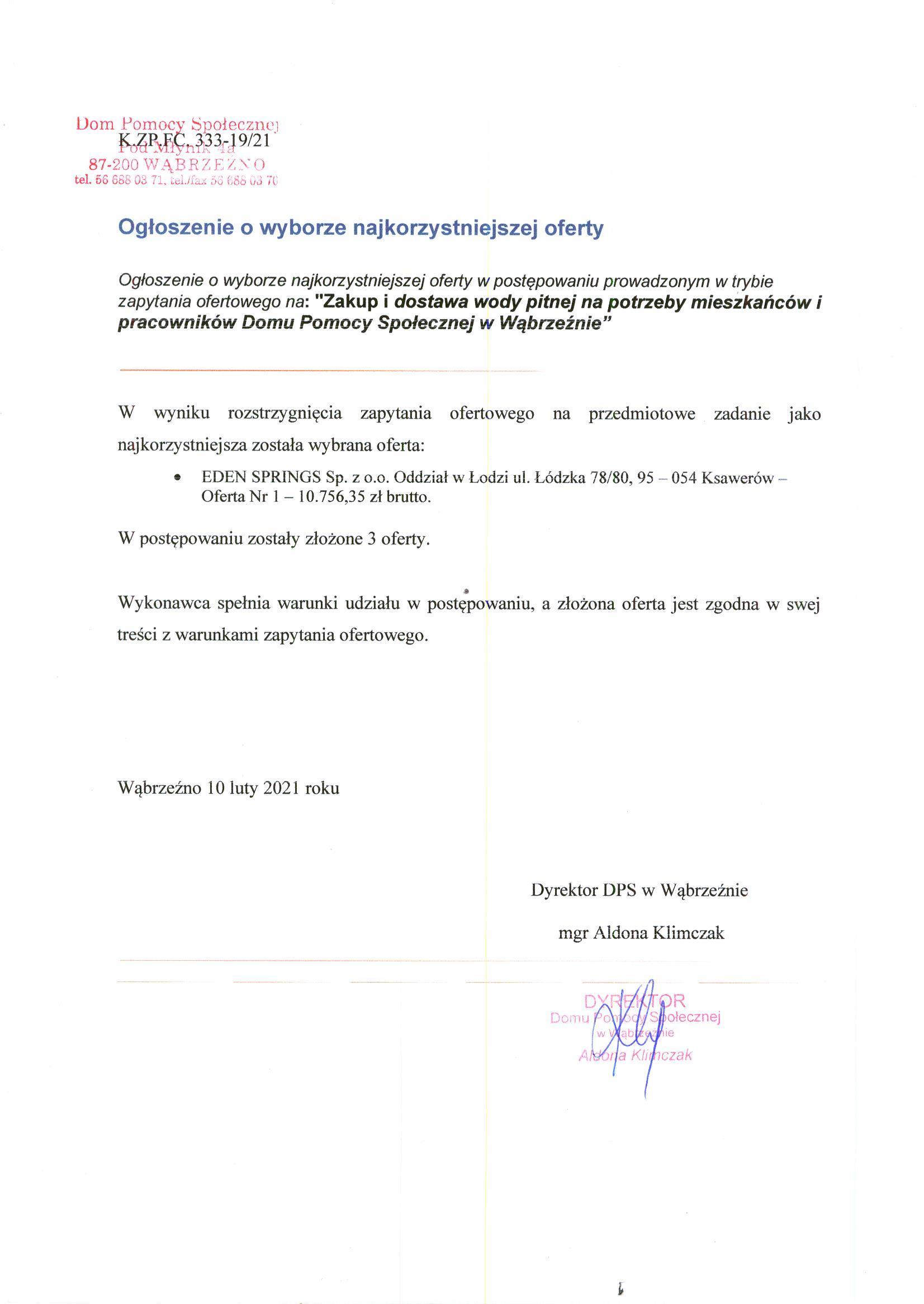 „Zakup i dostawa wody pitnej na potrzeby mieszkańców i pracowników Domu Pomocy Społecznej w Wąbrzeźnie” |