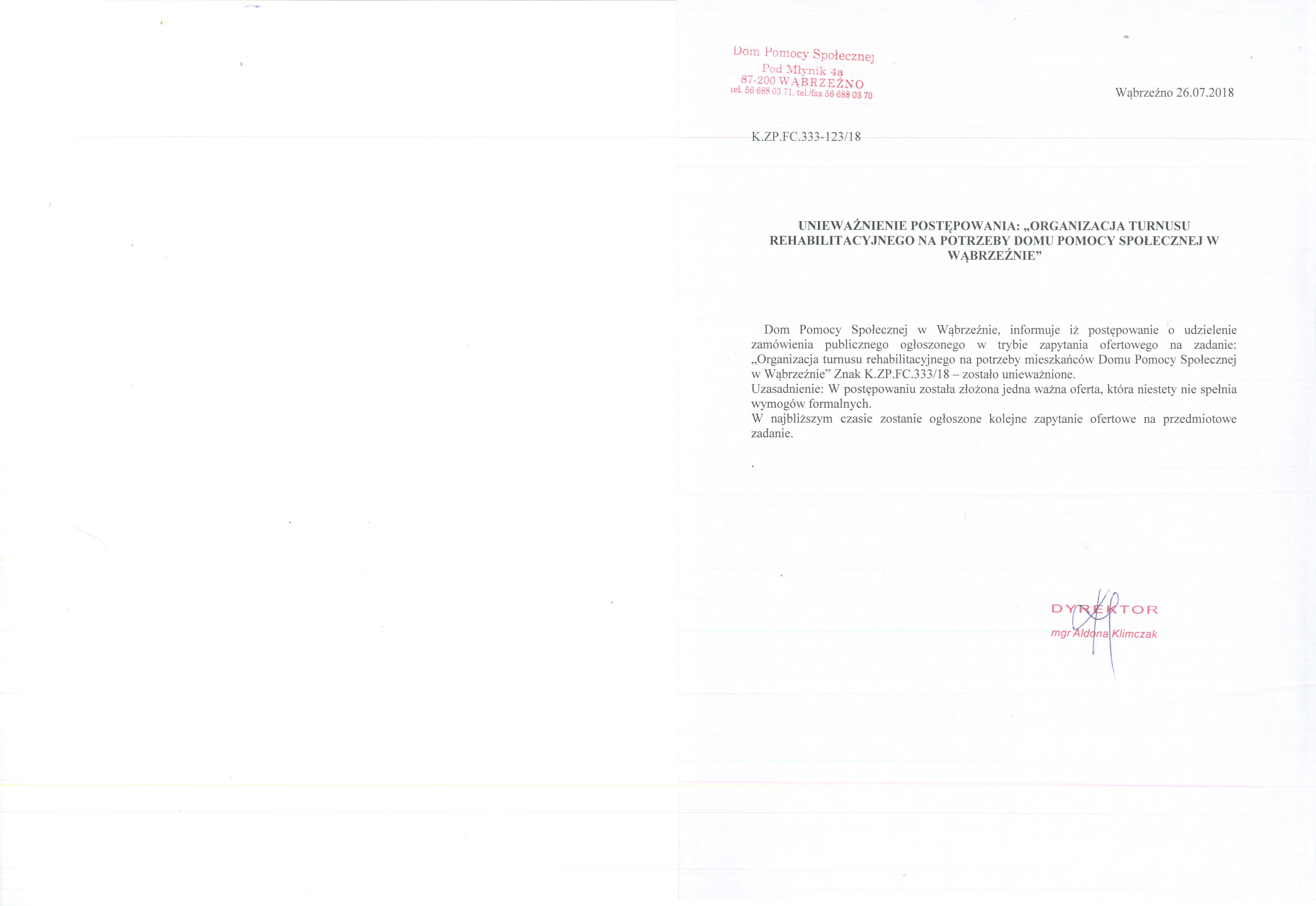 Dom Pomocy Społecznej w Wąbrzeźnie, informuje iż postępowanie o udzielenie zamówienia publicznego ogłoszonego w trybie zapytania ofertowego na zadanie: „Organizacja turnusu rehabilitacyjnego na potrzeby mieszkańców Domu Pomocy Społecznej w Wąbrzeźnie” Znak K.ZP.FC.333/18 – zostało unieważnione.