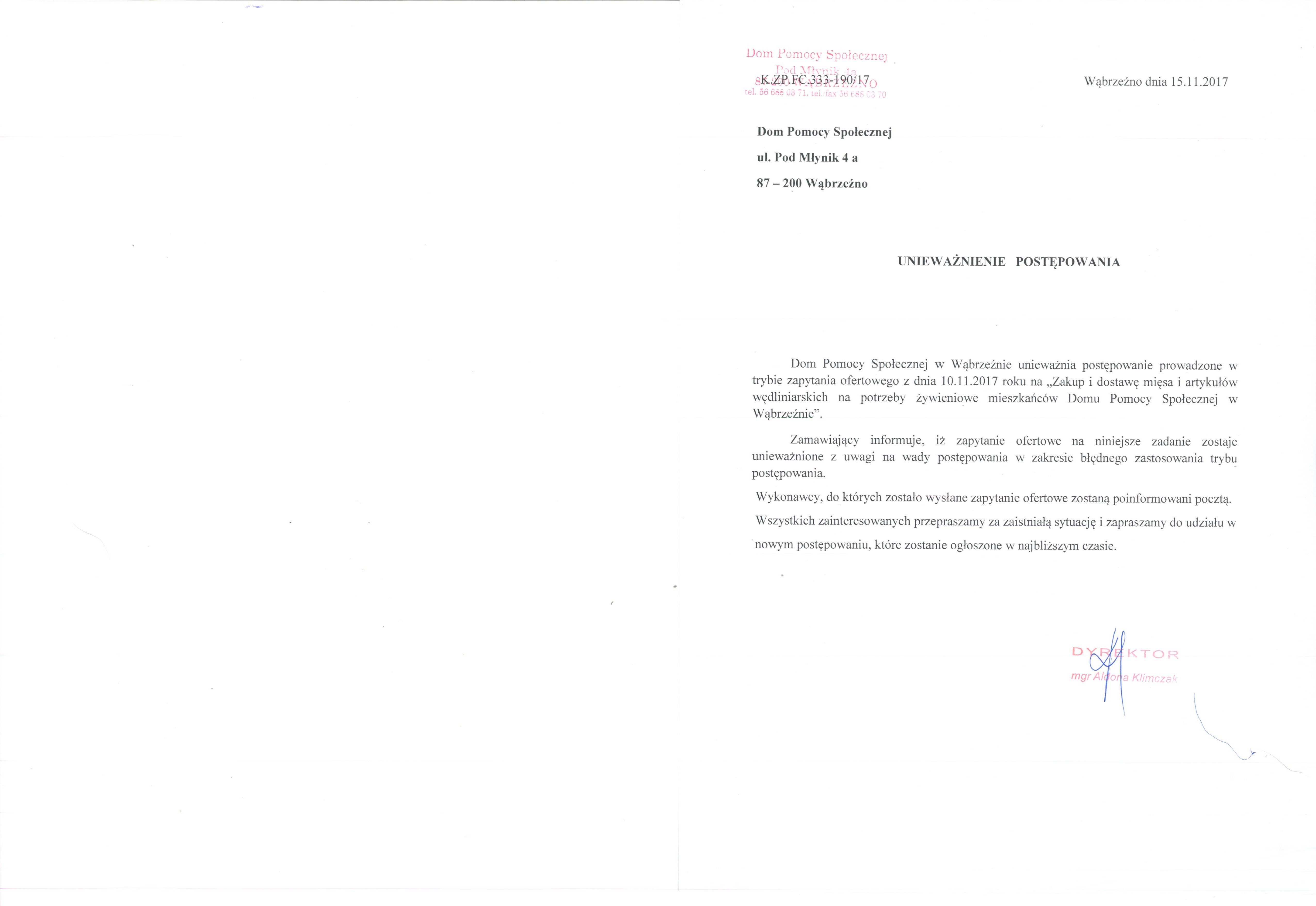 Dom Pomocy Społecznej w Wąbrzeźnie unieważnia postępowanie prowadzone w trybie zapytania ofertowego z dnia 10.11.2017 roku na „Zakup i dostawę mięsa i artykułów wędliniarskich na potrzeby żywieniowe mieszkańców Domu Pomocy Społecznej w Wąbrzeźnie”.