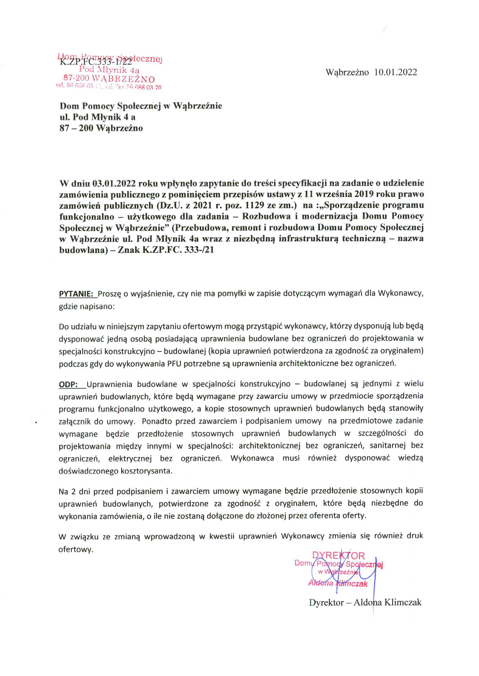 W dniu 03.01.2022 roku wpłynęło zapytanie do treści specyfikacji na zadanie o udzielenie zamówienia publicznego z pominięciem przepisów ustawy z 11 września 2019 roku prawo zamówień publicznych (Dz.U. z 2021 r. poz. 1129 ze zm.) na :„Sporządzenie programu funkcjonalno – użytkowego dla zadania – Rozbudowa i modernizacja Domu Pomocy Społecznej w Wąbrzeźnie” (Przebudowa, remont i rozbudowa Domu Pomocy Społecznej w Wąbrzeźnie ul. Pod Młynik 4a wraz z niezbędną infrastrukturą techniczną – nazwa budowlana) – Znak K.ZP.FC. 333-/21