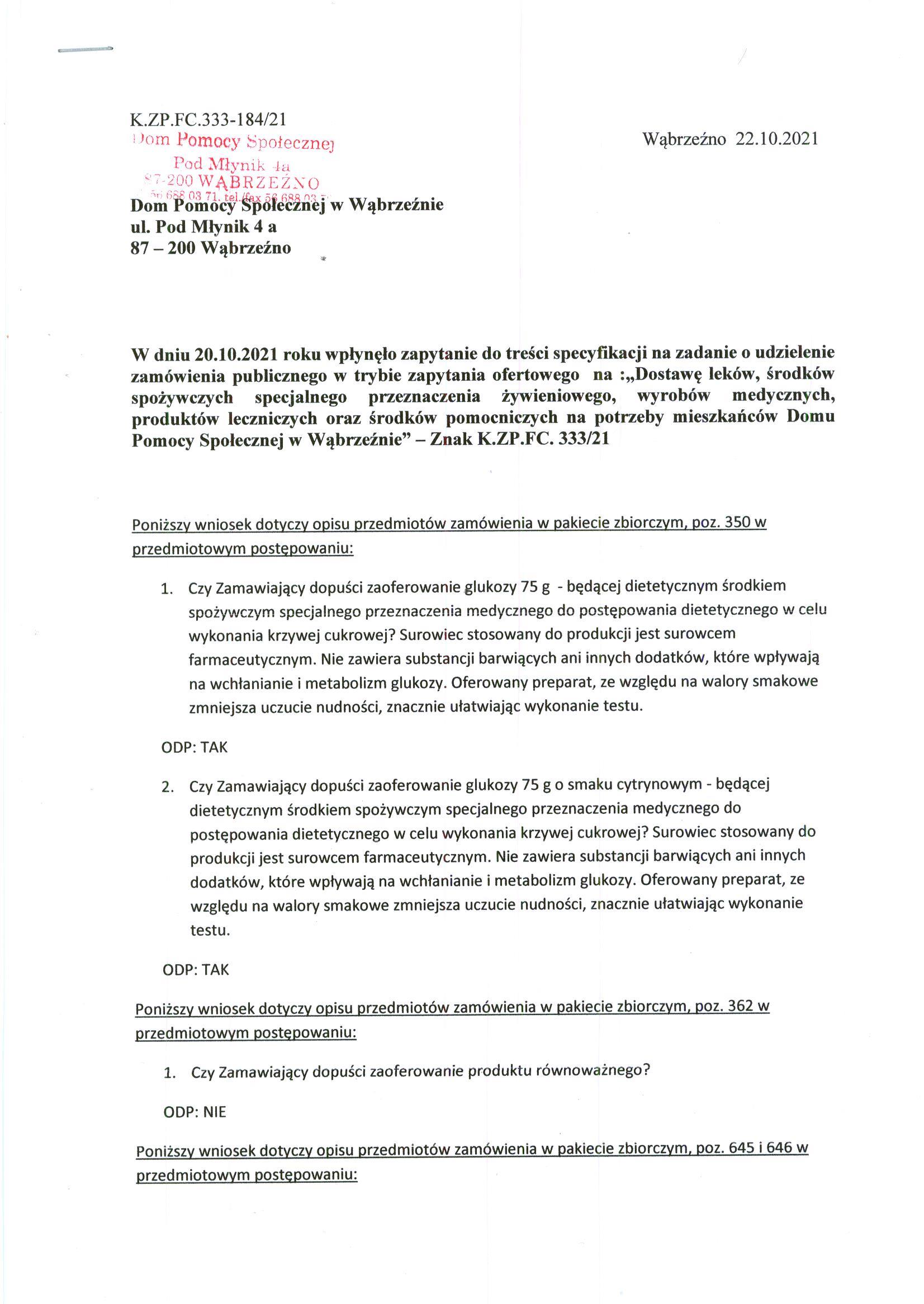 W dniu 20.10.2021 roku wpłynęło zapytanie do treści specyfikacji na zadanie o udzielenie zamówienia publicznego w trybie zapytania ofertowego na:„Dostawę leków, środków spożywczych specjalnego przeznaczenia żywieniowego, wyrobów medycznych, produktów leczniczych oraz środków pomocniczych na potrzeby mieszkańców Domu Pomocy Społecznej w Wąbrzeźnie” – Znak K.ZP.FC. 333/21