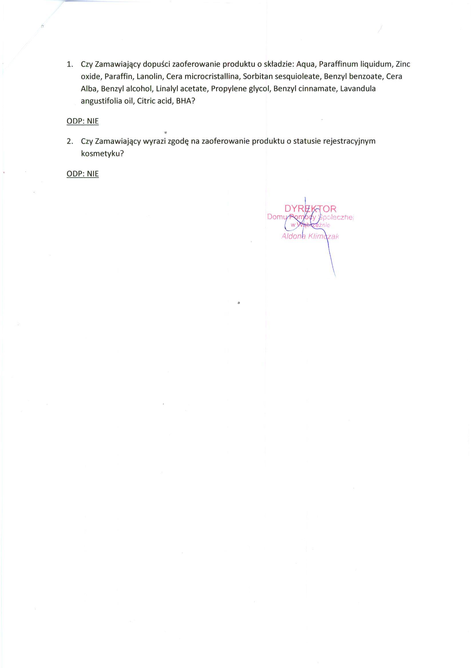 - Czy Zamawiający dopuści zaoferowanie produktu o składzie: Aqua, Paraffinum liquidum, Zinc oxide, Paraffin, Lanolin, Cera microcristallina, Sorbitan sesquioleate, Benzyl benzoate, Cera Alba, Benzyl alcohol, Linalyl acetate, Propylene glycol, Benzyl cinnamate, Lavandula angustifolia oil, Citric acid, BHA?