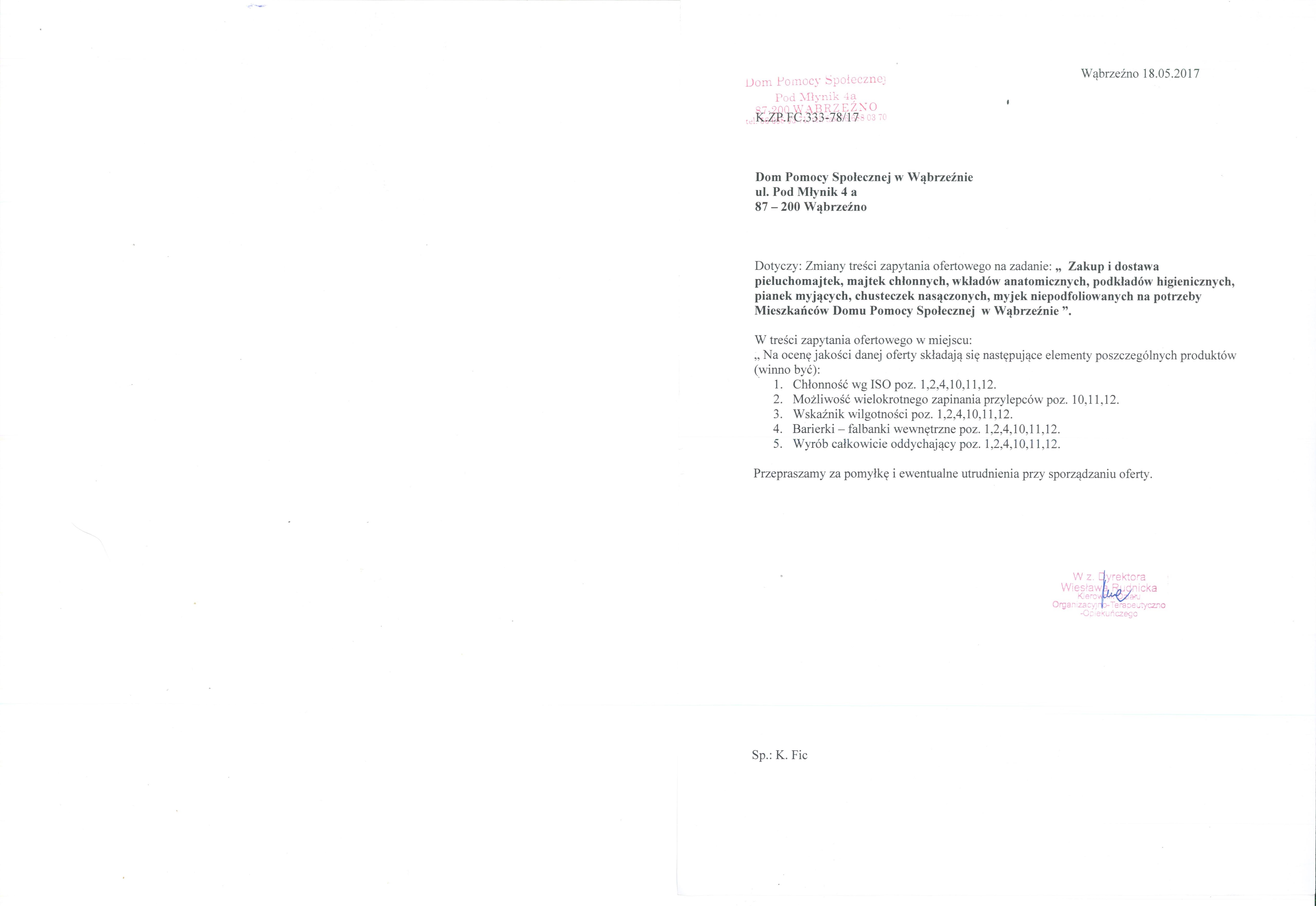 Dotyczy: Zmiany treści zapytania ofertowego na zadanie: „ Zakup i dostawa pieluchomajtek, majtek chłonnych, wkładów anatomicznych, podkładów higienicznych, pianek myjących, chusteczek nasączonych, myjek niepodfoliowanych na potrzeby Mieszkańców Domu Pomocy Społecznej w Wąbrzeźnie ”.
