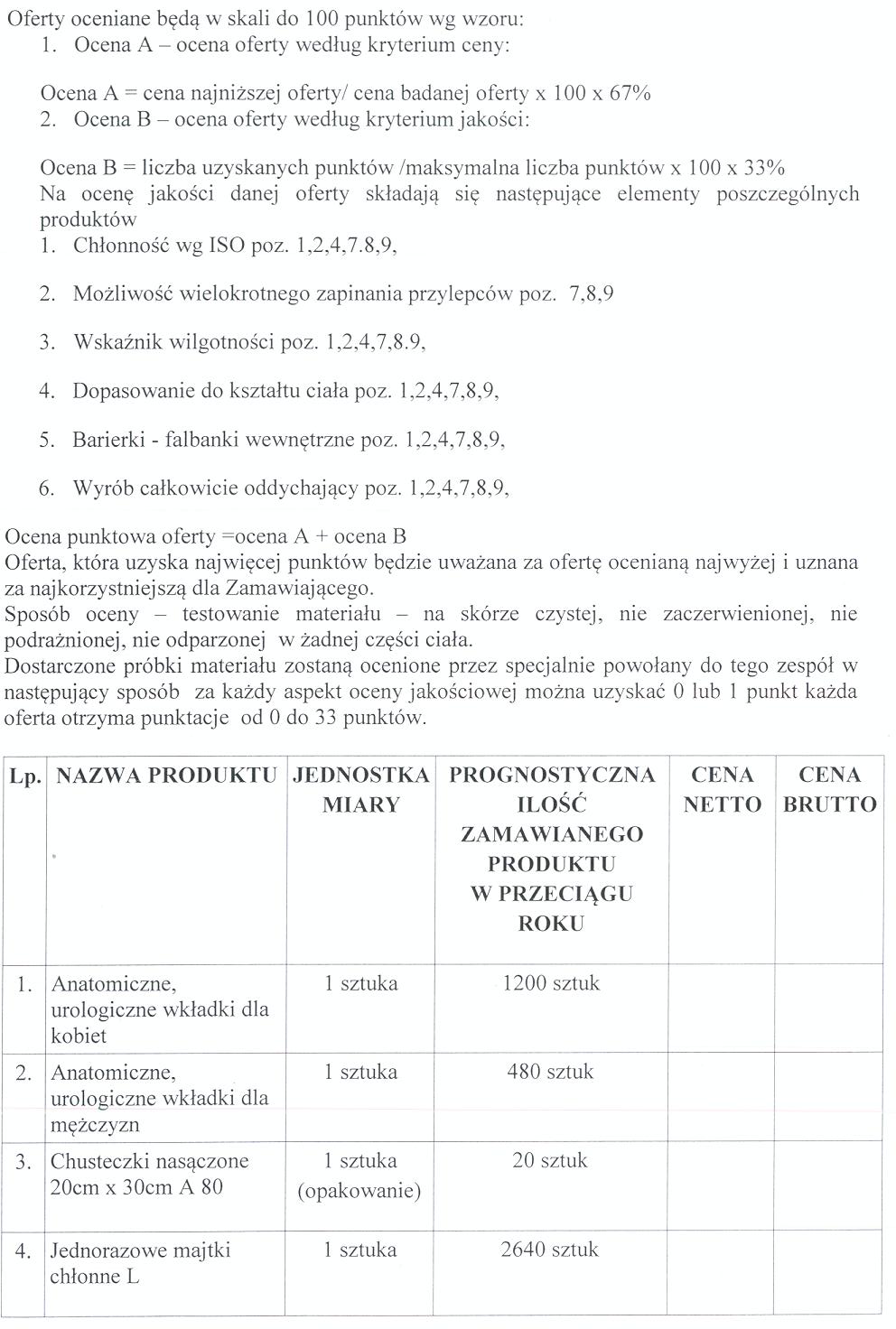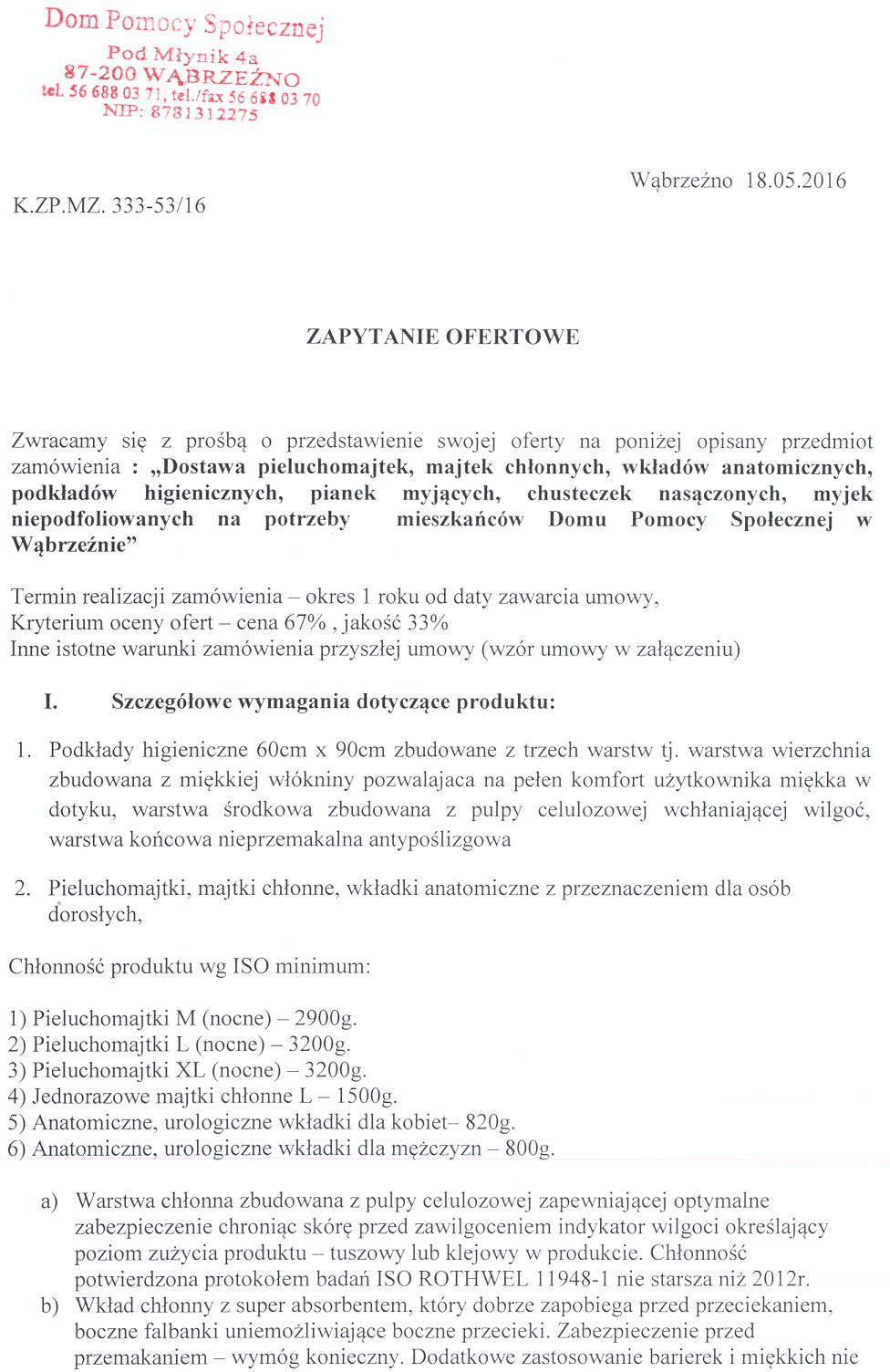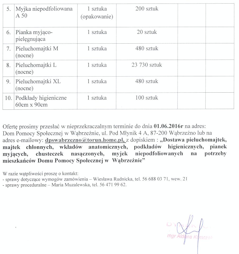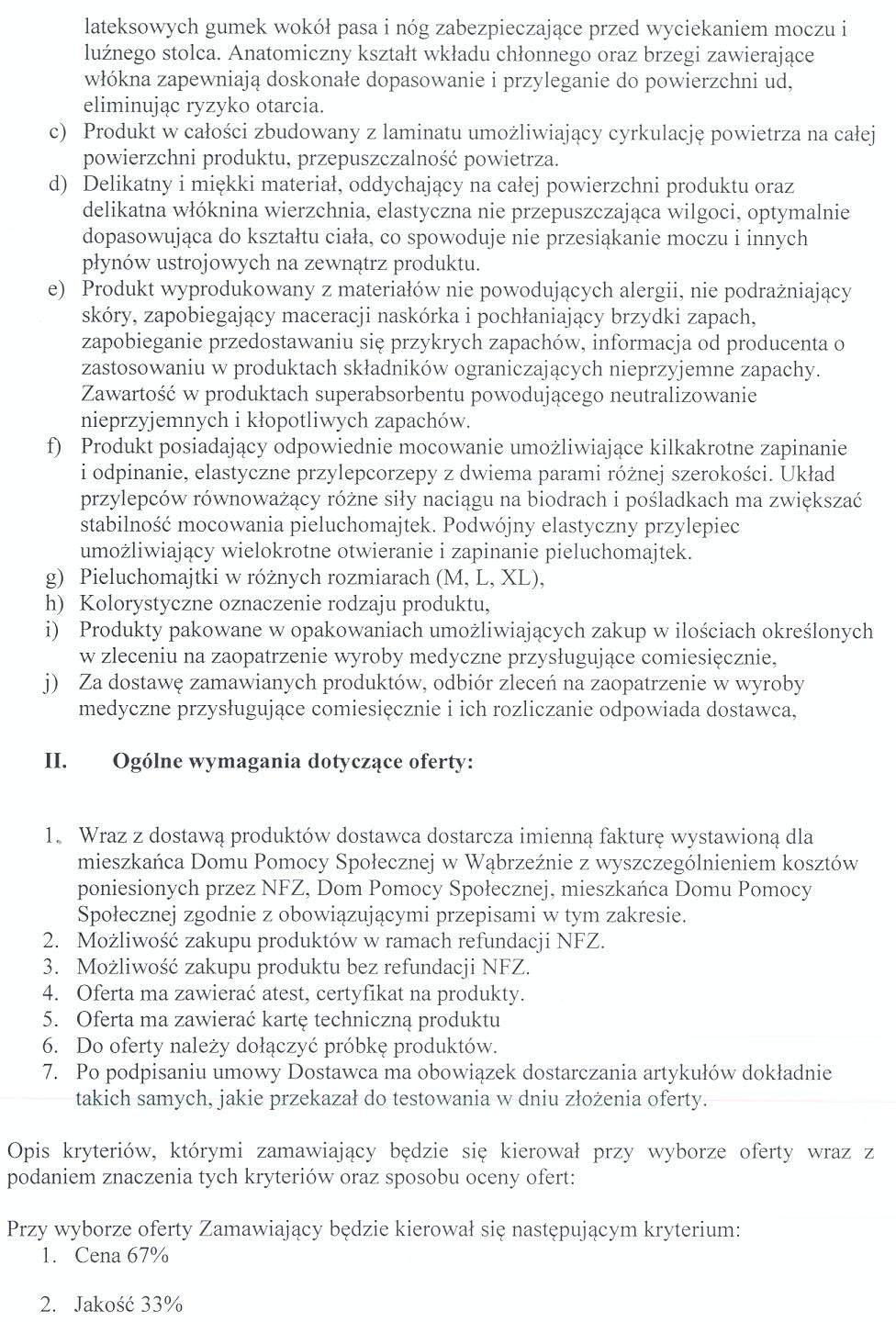 Zwracamy się z prośbą o przedstawienie swojej oferty na poniżej opisany przedmiot zamówienia : „Dostawa pieluchomajtek, majtek chłonnych, wkładów anatomicznych, podkładów higienicznych, pianek myjących, chusteczek nasączonych, myjek niepodfoliowanych na potrzeby mieszkańców Domu Pomocy Społecznej w Wąbrzeźnie”
