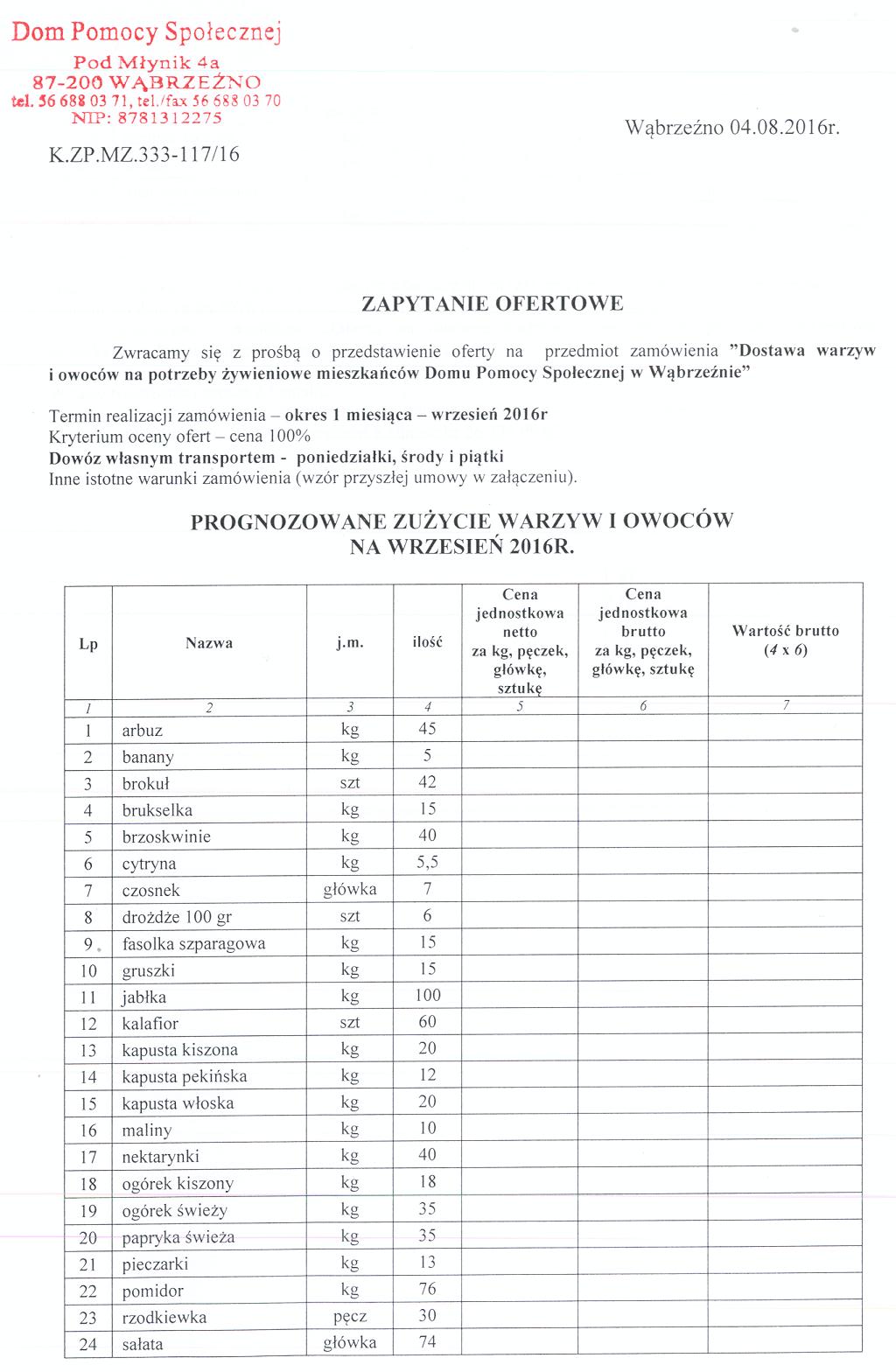 Zwracamy się z prośbą o przedstawienie oferty na przedmiot zamówienia ”Dostawa warzyw i owoców na potrzeby żywieniowe mieszkańców Domu Pomocy Społecznej w Wąbrzeźnie”