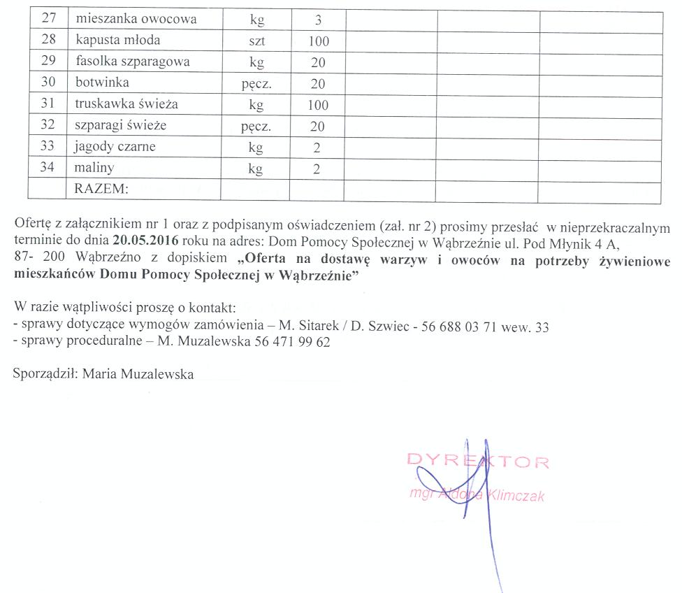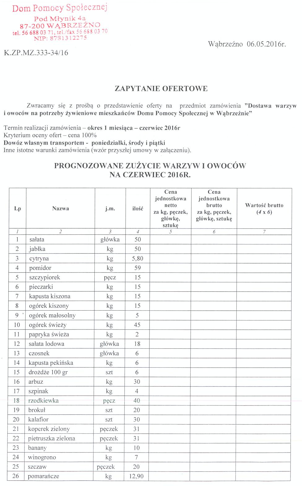 Ofertę z załącznikiem nr 1 oraz z podpisanym oświadczeniem (zał. nr 2) prosimy przesłać w nieprzekraczalnym terminie do dnia 20.05.2016 roku na adres: Dom Pomocy Społecznej w Wąbrzeźnie ul. Pod Młynik 4 A, 87- 200 Wąbrzeźno z dopiskiem „Oferta na dostawę warzyw i owoców na potrzeby żywieniowe mieszkańców Domu Pomocy Społecznej w Wąbrzeźnie”