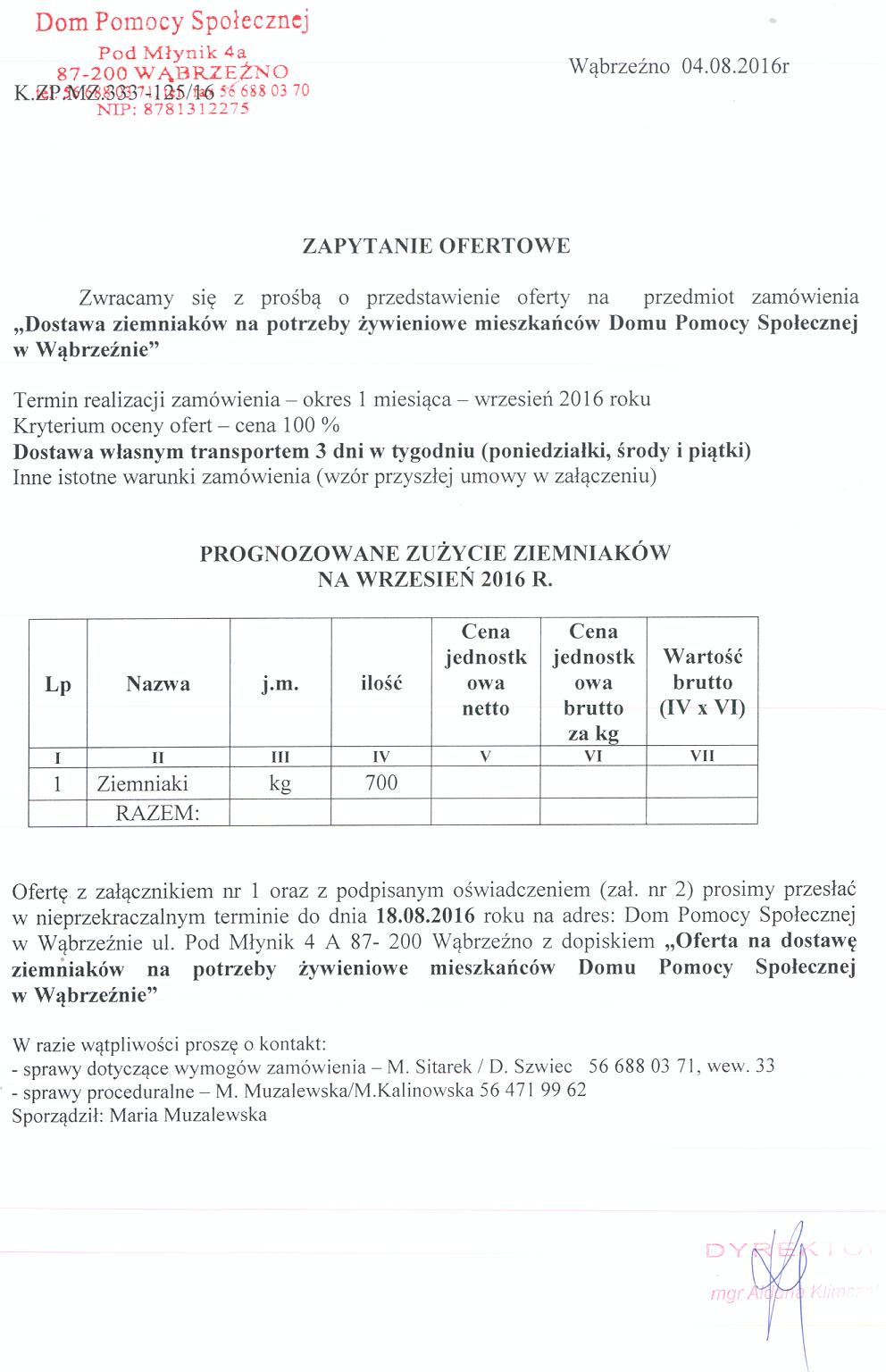 Zwracamy się z prośbą o przedstawienie oferty na  przedmiot zamówienia            „Dostawa ziemniaków na potrzeby żywieniowe mieszkańców Domu Pomocy Społecznej w Wąbrzeźnie”