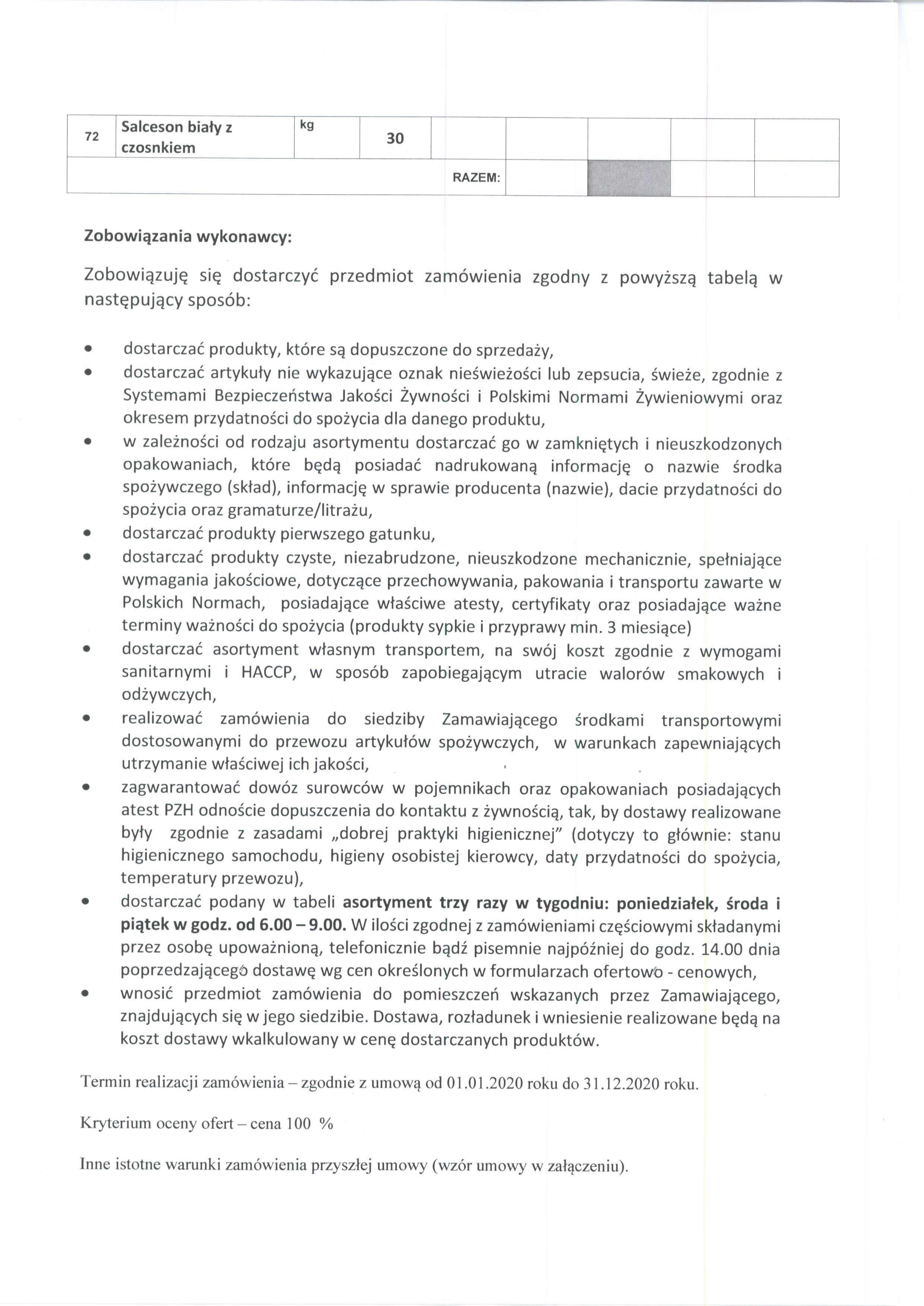 Termin realizacji zamówienia – zgodnie z umową od 01.01.2020 roku do 31.12.2020 roku.
