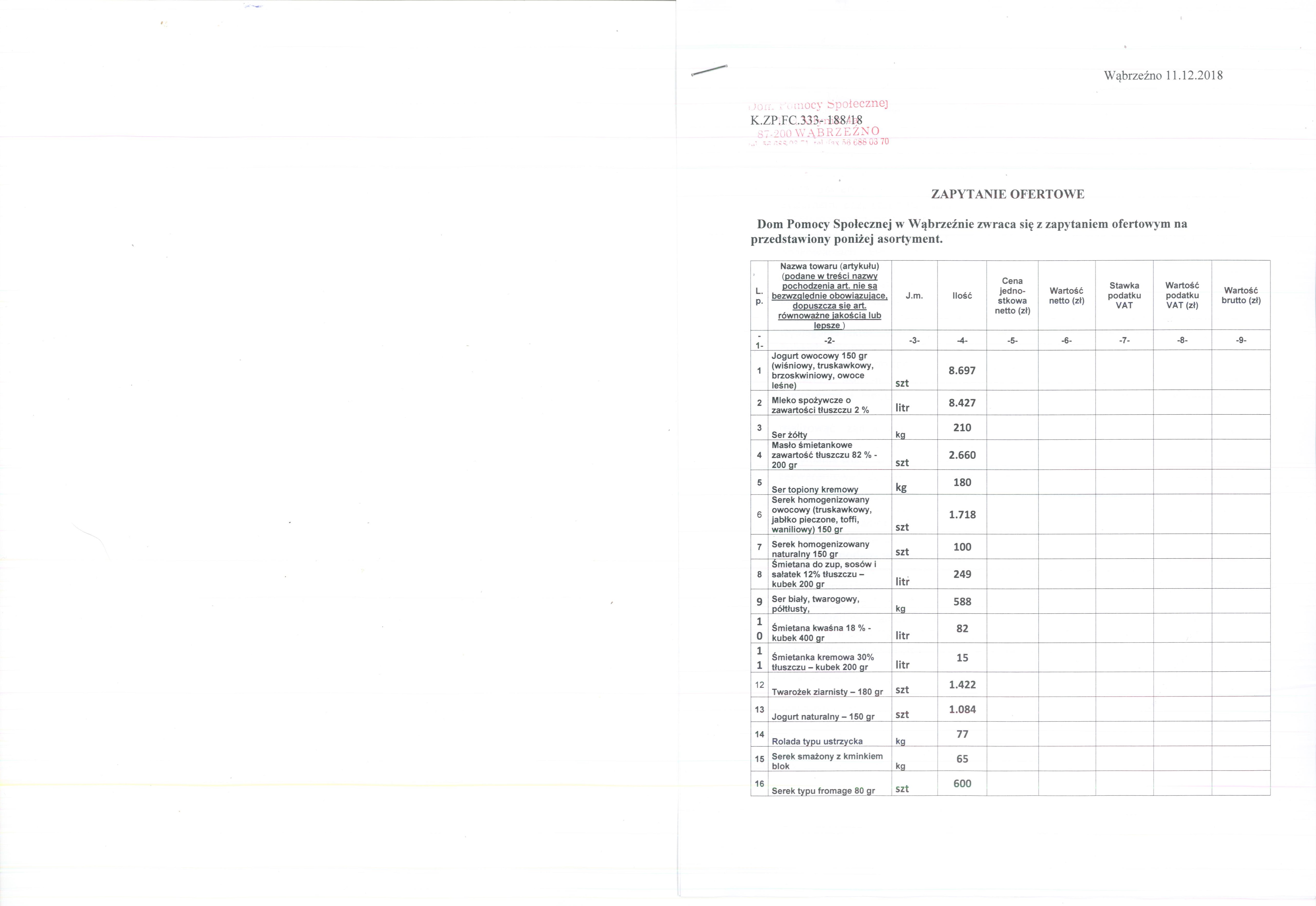 Dom Pomocy Społecznej w Wąbrzeźnie zwraca się z zapytaniem ofertowym na przedstawiony poniżej asortyment.