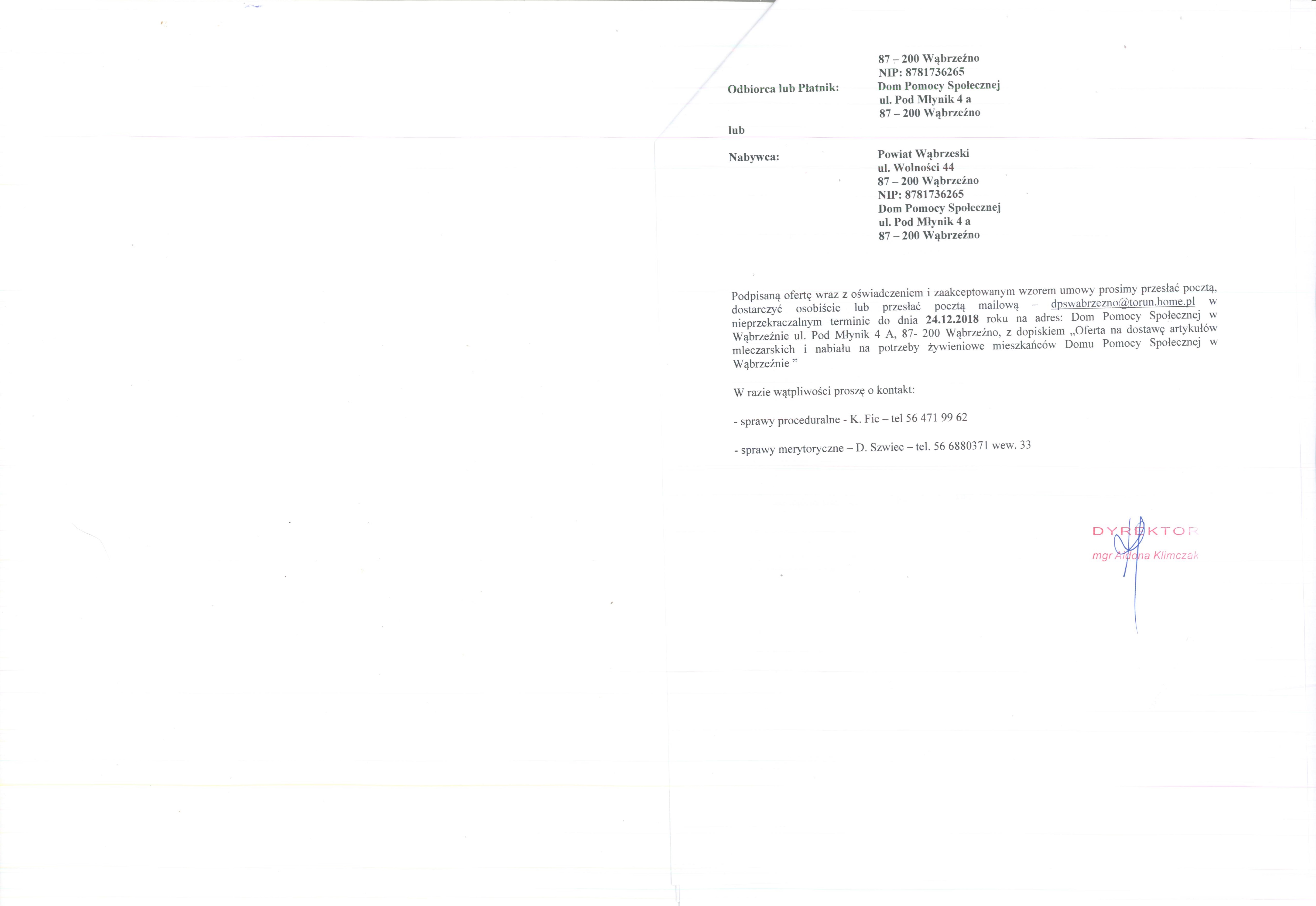 Podpisaną ofertę wraz z oświadczeniem i zaakceptowanym wzorem umowy prosimy przesłać pocztą, dostarczyć osobiście lub przesłać pocztą mailową – dpswabrzezno[at]torun[dot]home[dot]pl w nieprzekraczalnym terminie do dnia 24.12.2018 roku na adres: Dom Pomocy Społecznej w Wąbrzeźnie ul. Pod Młynik 4 A, 87- 200 Wąbrzeźno, z dopiskiem „Oferta na dostawę artykułów mleczarskich i nabiału na potrzeby żywieniowe mieszkańców Domu Pomocy Społecznej w Wąbrzeźnie ”