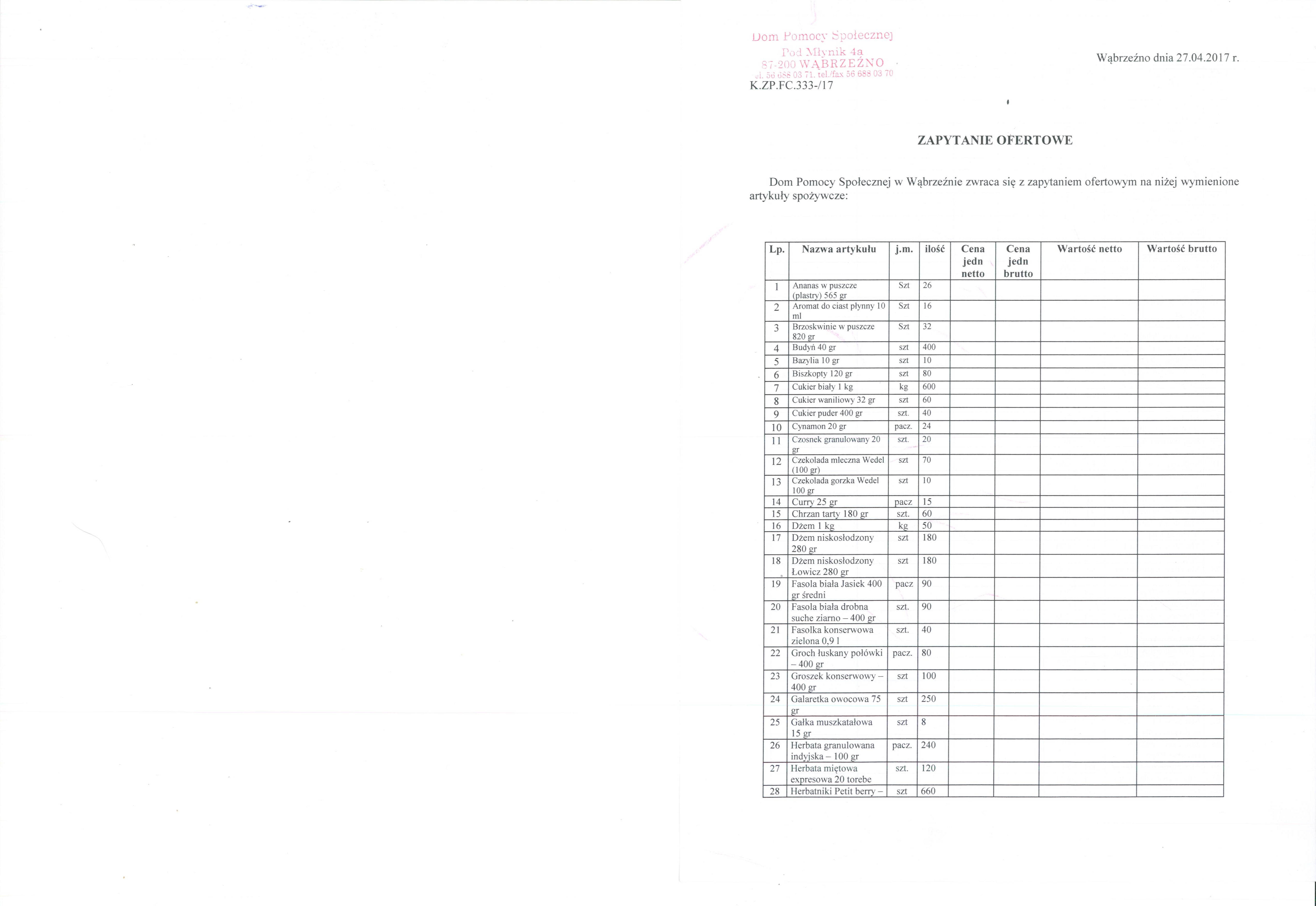 Dom Pomocy Społecznej w Wąbrzeźnie zwraca się z zapytaniem ofertowym na niżej wymienione artykuły spożywcze: